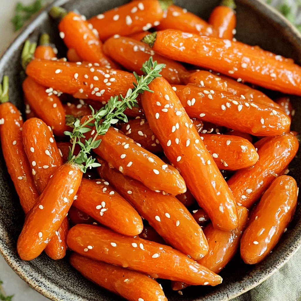 After cooking, take the carrots out and place them back into the bowl. Toss them with any remaining glaze for extra flavor. Serve the glazed carrots on a dish. If you like, add fresh thyme leaves and sesame seeds on top for a crunchy finish. This dish looks beautiful and tastes amazing!