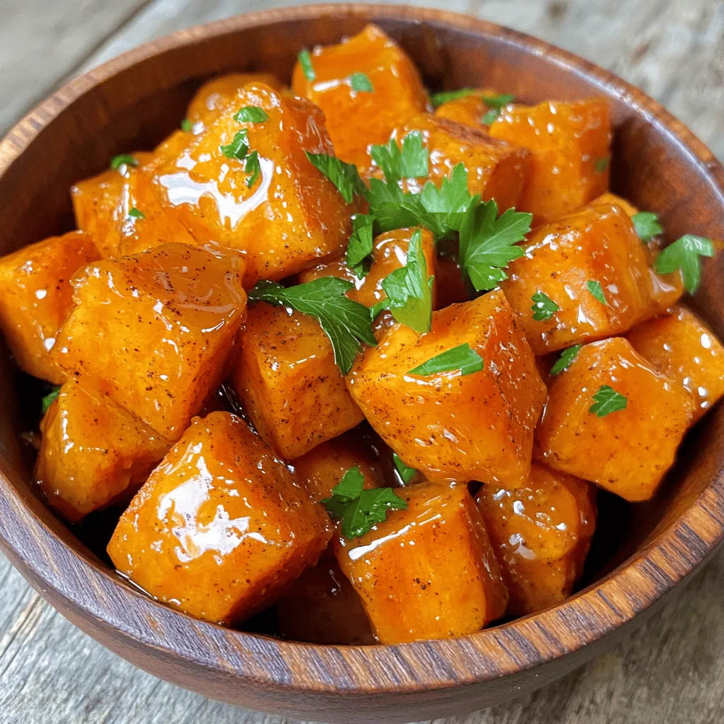 Garnish the sweet potatoes with chopped fresh parsley. This adds color and a fresh touch. Serve them warm as a side dish or a tasty snack. They pair well with grilled meats or can stand alone. Enjoy these sweet and savory bites!