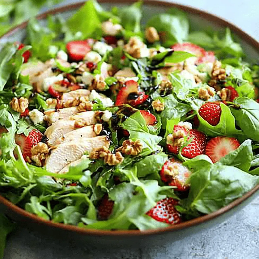 Finally, arrange the sliced chicken on top of the salad. Drizzle the balsamic dressing over everything. Toss gently to avoid bruising the greens and strawberries. For the finishing touch, sprinkle toasted walnuts and add fresh basil leaves for a pop of color and flavor.