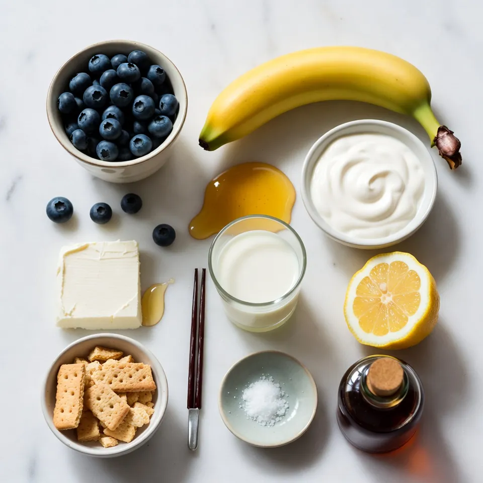 - In a blender, add the blueberries, banana, Greek yogurt, cream cheese, honey or maple syrup, milk, lemon juice, lemon zest, vanilla extract, and a pinch of salt.