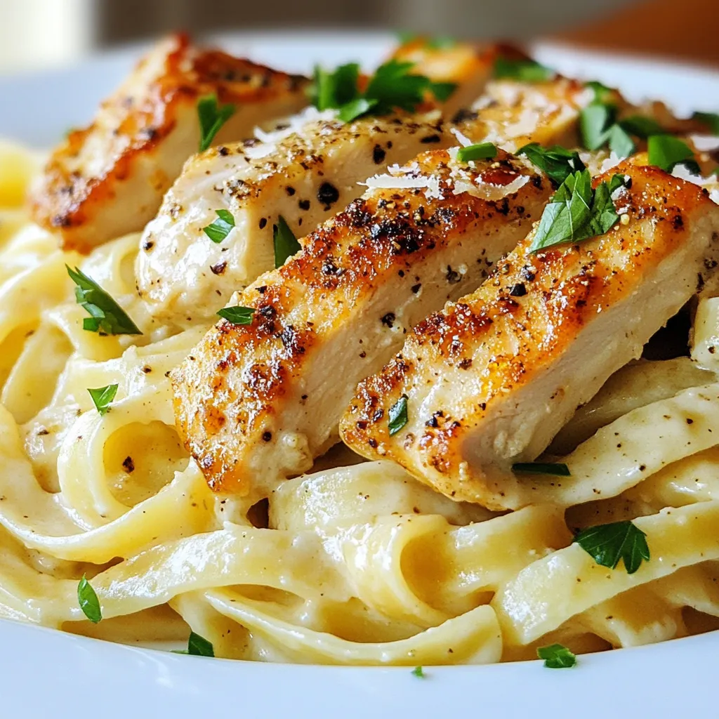• Slice the cooked chicken breast and arrange it on top of the fettuccine Alfredo. Garnish with chopped parsley for a fresh touch.
