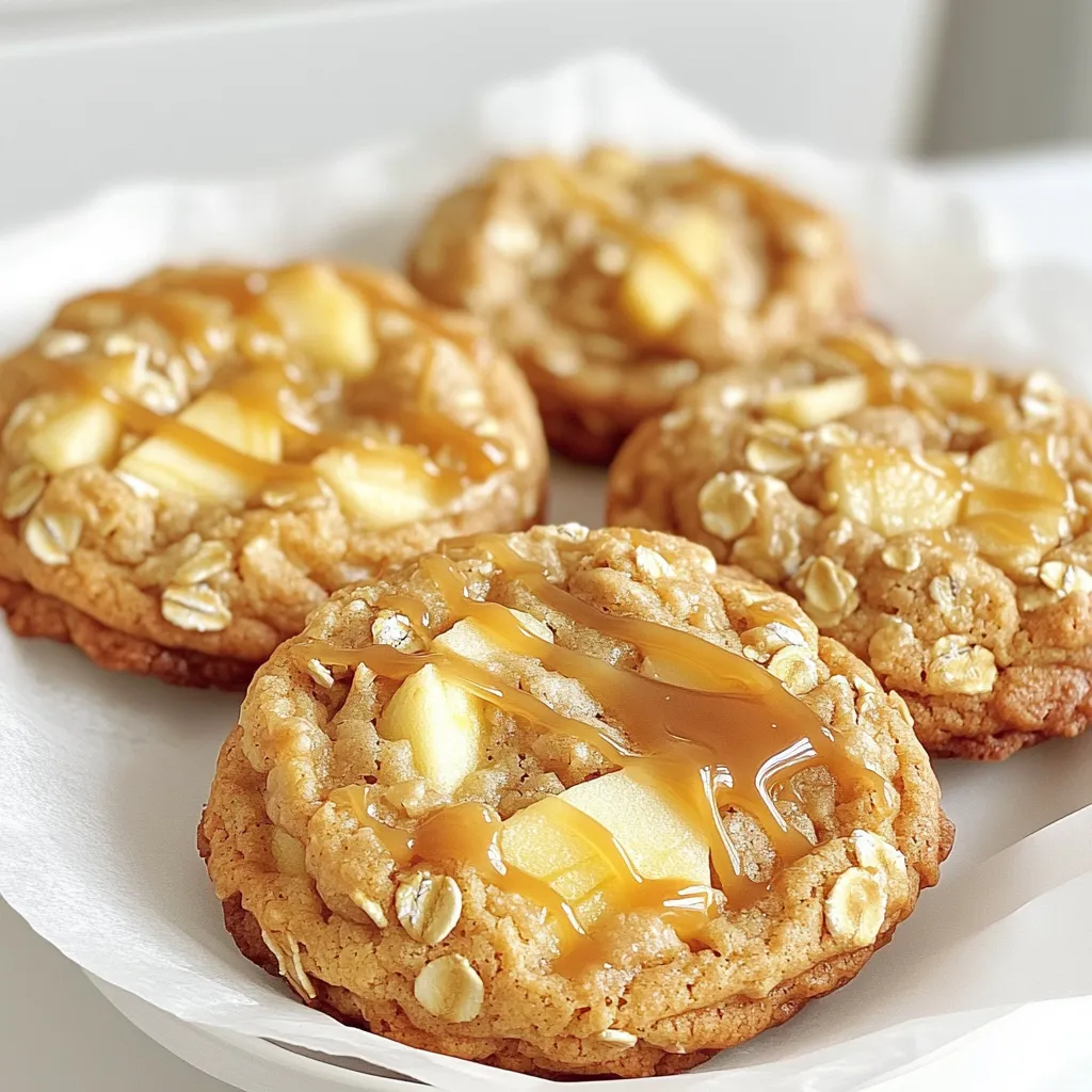 Once they are done, I remove the cookies from the oven. I let them cool for a few minutes on the pan. Then, I transfer them to a wire rack. This helps them cool down faster. If I want, I drizzle extra caramel sauce over the cookies for a sweet touch. For presentation, I serve them on a wooden platter. I add some apple slices and a small bowl of caramel for dipping. This makes for a lovely treat!