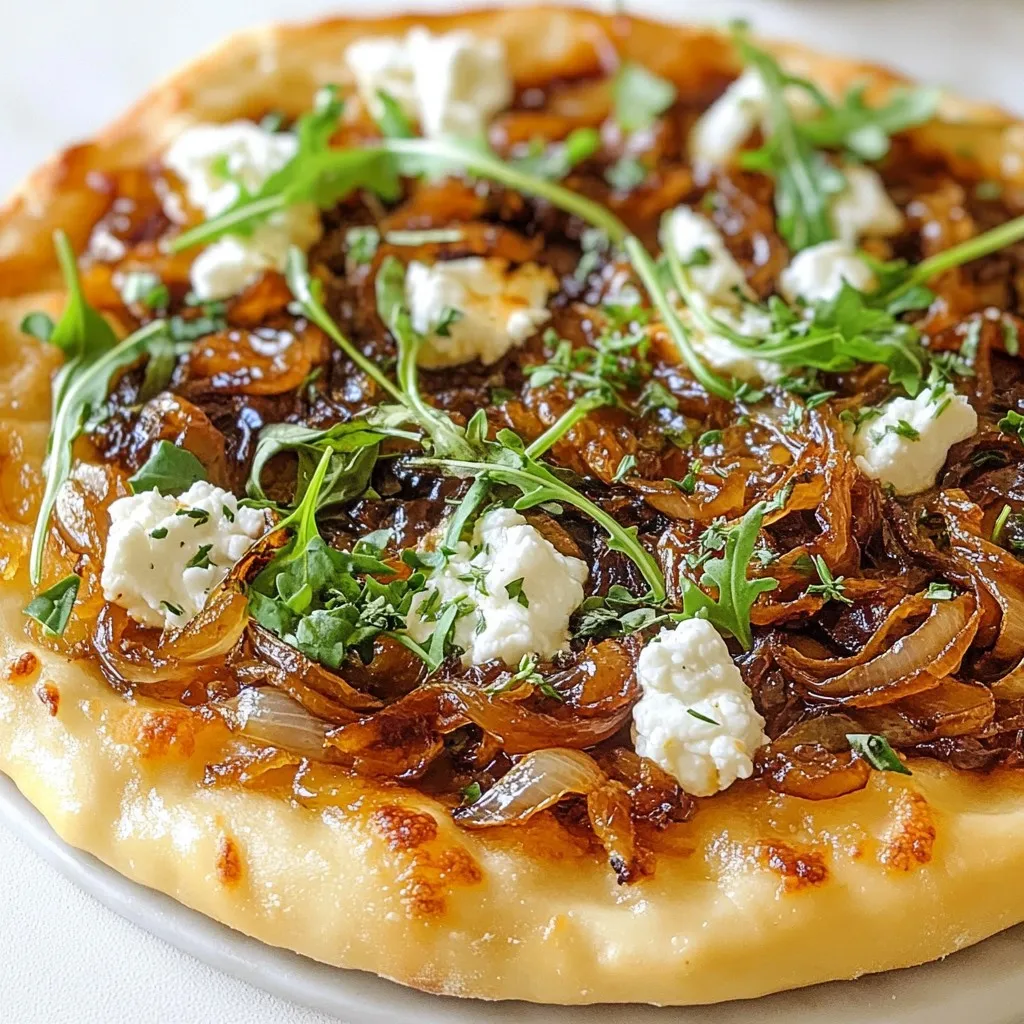 The base of this pizza is the dough. You can use store-bought dough or make your own. Then, the caramelized onions are the star. Their sweet and rich taste shines through. Use two large onions for the best flavor. Olive oil helps cook the onions until they are golden. Balsamic vinegar adds a tangy twist, making the onions even more special. Goat cheese provides a creamy texture. It pairs well with the caramelized onions. Shredded mozzarella adds a nice stretch and melts beautifully. Lastly, fresh thyme gives a lovely herbal note.
