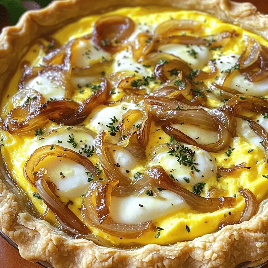Grab your pre-made pie crust and place it in a pie dish. Spread the caramelized onions evenly on the bottom. Then, pour the egg and cream mixture over the onions. Top it off with one cup of grated Swiss cheese. Now, it’s time to bake! Place the quiche in a preheated oven at 375°F (190°C). Bake for about 30 to 35 minutes. You want it puffed and golden brown. A knife should come out clean when inserted in the center. Once baked, let it cool for about 10 minutes before slicing. This wait helps keep the slices neat.