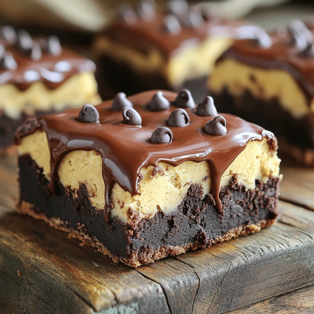 - 1 cup unsalted butter (2 sticks), melted - 2 cups granulated sugar - 4 large eggs - 1 teaspoon vanilla extract - 1 cup all-purpose flour - 1 cup cocoa powder - 1/2 teaspoon salt - 1 cup chocolate chips - 1/2 cup unsalted butter, softened - 3/4 cup brown sugar, packed - 1/4 cup granulated sugar - 1 teaspoon vanilla extract - 1 cup all-purpose flour - 1/2 teaspoon salt - 1/2 cup chocolate chips The brownie layer brings rich, chocolatey goodness. The melted butter and sugar blend create a sweet base. Eggs add moisture and fluffiness. Cocoa powder makes it deep and dark. Don’t forget the chocolate chips for pockets of melted chocolate. The cookie dough layer gives a fun twist. Softened butter and brown sugar create a creamy mix. Adding granulated sugar adds a nice sweetness. Vanilla extract offers a warm flavor. All-purpose flour thickens it up. The salt balances the sweetness. More chocolate chips mean more yum! These two layers work together to create a delightful treat. They mix fudgy, chewy, and crunchy textures. You will love every bite of this dessert! - Preheat your oven to 350°F (175°C). - Grease a 9x13 inch baking dish or line it with parchment paper. - Melt the butter and mix in the sugar. - Add eggs and vanilla, then incorporate flour, cocoa powder, and salt. - Fold in the chocolate chips and bake. - Cream together softened butter, brown sugar, and granulated sugar. - Add vanilla, flour, and salt, folding in chocolate chips. - Spread the cookie dough on cooled brownies and refrigerate. - Cut into squares and serve either chilled or at room temperature. To get your brownies just right, you can adjust the bake time. If you like fudgy brownies, aim for 25 minutes. For cakey brownies, extend the time to about 30 minutes. Checking for doneness is simple. Insert a toothpick in the center; it should come out with a few moist crumbs. You can boost flavor in both layers. Consider adding nuts like walnuts or pecans to the brownie base. You could also mix in flavored extracts, like almond or coconut, to the cookie dough. For a lovely finish, drizzle melted chocolate over the top. This adds both flair and extra chocolatey goodness. One common error is overmixing the batter. This can make brownies tough instead of soft. Another mistake is not letting the brownies cool fully before adding the cookie dough. If the brownies are warm, the cookie dough layer can melt. Cool the brownies completely for the best results. {{image_2}} You can try different types of cocoa powders to change the taste. Dark cocoa gives a rich flavor. You can also use milk chocolate for a sweeter treat. If you need gluten-free brownies, use almond flour or coconut flour instead of all-purpose flour. These flours add a unique taste and texture. For the cookie dough, you can make it without eggs. Just mix flour, butter, and sugar. This keeps it safe to eat. If you want a vegan option, use coconut oil instead of butter. Substitute maple syrup for the sugar. This way, you get a tasty, plant-based cookie dough. You can mix in fun flavors too! Try mint chocolate chip for a fresh twist. Just add mint extract to the brownie mix. Or, swirl in peanut butter for a creamy, nutty flavor. This adds a nice contrast to the sweet cookie dough. You can get creative and find your favorite mix! To keep your brownies and cookie dough fresh, use airtight containers. Place the brownies in one container. Keep the cookie dough layer in another. This helps to keep both layers moist and tasty. I recommend glass or plastic containers with tight lids. They seal in freshness and make clean-up easy. If you have leftover brownies, you can freeze them. First, let the brownies cool completely. Then, cut them into squares. Wrap each square in plastic wrap. Place the wrapped brownies in a freezer-safe bag or container. To thaw, leave them in the fridge overnight. For a quick fix, you can microwave them for a few seconds. In the fridge, brownies stay fresh for about a week. If you see any signs of mold or an off smell, toss them. Brownies that have gone bad may feel dry or hard. Always check before you eat! Enjoy your sweet treat while it is still delicious. Yes, you can make these brownies a day before you plan to serve them. Bake the brownies and let them cool completely. After they cool, add the cookie dough layer. Cover the dish with plastic wrap and store it in the fridge. This will help the cookie dough firm up. For the best taste, serve them the next day. If you don't have unsalted butter, you can use coconut oil or margarine. Both options will work well. Coconut oil adds a slight coconut taste, which can be nice. Margarine is a good choice if you want a more neutral flavor. Just keep in mind that each fat may change the texture a bit. To boost the chocolate flavor, try adding extra chocolate chips. You can also use dark chocolate cocoa powder instead of regular cocoa powder. Another option is to drizzle melted chocolate over the top before serving. This adds a rich layer of chocolate that everyone will love. Eating raw cookie dough can be risky due to raw flour and eggs. However, you can make edible cookie dough by using heat-treated flour and skipping the eggs. This way, you can enjoy the dough safely. Just remember to use all-purpose flour that has been heated to kill any harmful bacteria. This blog post covered how to make delicious brownie cookie dough bars from scratch. You learned the key ingredients, step-by-step instructions, and helpful tips for the perfect texture. Remember to avoid common mistakes and consider fun variations. Whether you serve them chilled or at room temp, they will be a hit. Enjoy experimenting and sharing these treats with friends and family! Treat yourself to this fun baking project that satisfies every sweet tooth.