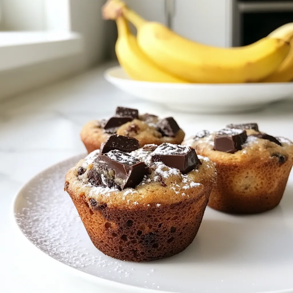 - 2 ripe bananas, mashed - 1/3 cup melted coconut oil - 1/2 cup brown sugar - 1 large egg - 1 teaspoon vanilla extract - 1 teaspoon baking soda - 1/2 teaspoon salt - 1 cup all-purpose flour - 1/2 cup dark chocolate chunks - 1/4 cup chopped walnuts (optional) To make these tasty muffins, start with ripe bananas. They should be soft and brown. The riper the bananas, the sweeter your muffins will be. Next, you need coconut oil. This oil gives the muffins a great flavor and keeps them moist. Use brown sugar for a rich sweetness. It adds depth to the flavor. You also need one large egg. The egg helps bind the ingredients together. Vanilla extract adds a lovely aroma and taste. Baking soda is key for rising. It creates a light texture in the muffins. Salt is a must too; it brings out all the flavors. Don't forget all-purpose flour. This is the base of the muffins. Dark chocolate chunks add a sweet, rich twist. If you like, toss in some walnuts for crunch. They add a nice bite and extra flavor. Gather these ingredients, and you are ready to bake! Each one plays a role in making your muffins easy and delicious. {{ingredient_image_1}} First, preheat your oven to 350°F (175°C). Line a muffin tin with paper liners. You can also spray it with non-stick cooking spray. This helps the muffins come out easily after baking. In a large bowl, mash the ripe bananas with a fork. You need about two bananas. Add in the melted coconut oil and mix well. Next, stir in the brown sugar. Now, add one large egg and a teaspoon of vanilla extract. Mix until everything is blended nicely. Sprinkle one teaspoon of baking soda and half a teaspoon of salt over the wet mix. Stir it in carefully. Gradually add one cup of all-purpose flour. Use a spatula to fold it in gently. Be careful not to over-mix; this keeps the muffins soft. Now, it’s time to add the fun stuff! Fold in half a cup of dark chocolate chunks. If you like some crunch, add a quarter cup of chopped walnuts too. Mix until the chocolate and walnuts are evenly spread through the batter. Take a spoon and divide the batter evenly into the muffin cups. Fill each cup about three-quarters full. This gives them room to rise while baking. Place the muffin tin in the preheated oven. Bake for 18 to 20 minutes. To check if they are done, insert a toothpick into the center of a muffin. If it comes out clean, they are ready! After baking, remove the muffins from the oven. Let them cool in the pan for five minutes. Then, transfer them to a wire rack to cool completely. For an extra treat, serve them warm with a dusting of powdered sugar or a drizzle of melted chocolate. Enjoy! To get the best muffin texture, use ripe bananas. Ripe bananas give a sweet flavor and moisture. Mash them well to avoid lumps in the batter. Mix wet and dry ingredients gently. Over-mixing can lead to tough muffins. Fill the muffin cups about three-quarters full. This allows room for them to rise. You can make a few swaps for a healthier muffin. Replace brown sugar with honey or maple syrup. This adds natural sweetness. For a lighter fat option, you can use unsweetened applesauce instead of coconut oil. This keeps muffins moist without added fat. If you want to reduce gluten, try almond flour or oat flour. Spices can enhance flavor in your muffins. Add a teaspoon of cinnamon or nutmeg for warmth. If you like a kick, try a pinch of cayenne pepper. You can also add extras like dried fruit or seeds. Chopped apples or cranberries work well. For a nutty crunch, add more walnuts or even pecans. The options are endless! Pro Tips Use Overripe Bananas: The riper the bananas, the sweeter and more flavorful your muffins will be. Look for bananas with brown spots for the best results. Chill the Batter: For extra fluffy muffins, let the batter rest in the fridge for about 30 minutes before baking. This helps the flour fully hydrate. Alternate Mix-ins: Feel free to customize your muffins by adding different mix-ins like chocolate chips, dried fruit, or seeds for added texture and flavor. Check for Doneness: To ensure your muffins are perfectly baked, use a toothpick to check for doneness; it should come out clean or with just a few crumbs attached. {{image_2}} You can make these muffins gluten-free easily. Just swap the all-purpose flour for a gluten-free blend. Look for one that has a good mix of flours, like almond and rice flour. This change keeps the muffins soft and tasty. You might need to add a bit more baking soda to help them rise. To make a vegan version, replace the egg with a flax egg. Mix one tablespoon of ground flaxseed with three tablespoons of water. Let it sit for a few minutes until it thickens. Use plant-based milk instead of coconut oil. You can also choose vegan chocolate chunks. This way, everyone can enjoy these muffins! You can customize your muffins by adding different fruits or nuts. Try chopped apples or berries for a fresh twist. You can also mix in nuts like pecans or almonds for a crunchy bite. Just make sure to keep the total amount similar to the chocolate chunks to keep the balance right. This makes each muffin unique and fun! To keep your muffins fresh, store them in an airtight container. Place a paper towel at the bottom to absorb moisture. This helps the muffins stay soft. Keep them at room temperature for up to three days. If you want them to last longer, consider freezing them. Freezing muffins is easy. First, let them cool completely. Wrap each muffin tightly in plastic wrap. Then, place the wrapped muffins in a freezer bag. Squeeze out as much air as possible. Label the bag with the date. You can freeze them for up to three months. When you want one, just take it out and let it thaw. To enjoy your muffins warm, reheat them in the oven. Preheat your oven to 350°F (175°C). Place the muffins on a baking sheet. Heat for about 5 to 10 minutes. This makes them soft and brings back the fresh taste. You can also use the microwave for a quicker option. Heat for 10 to 15 seconds