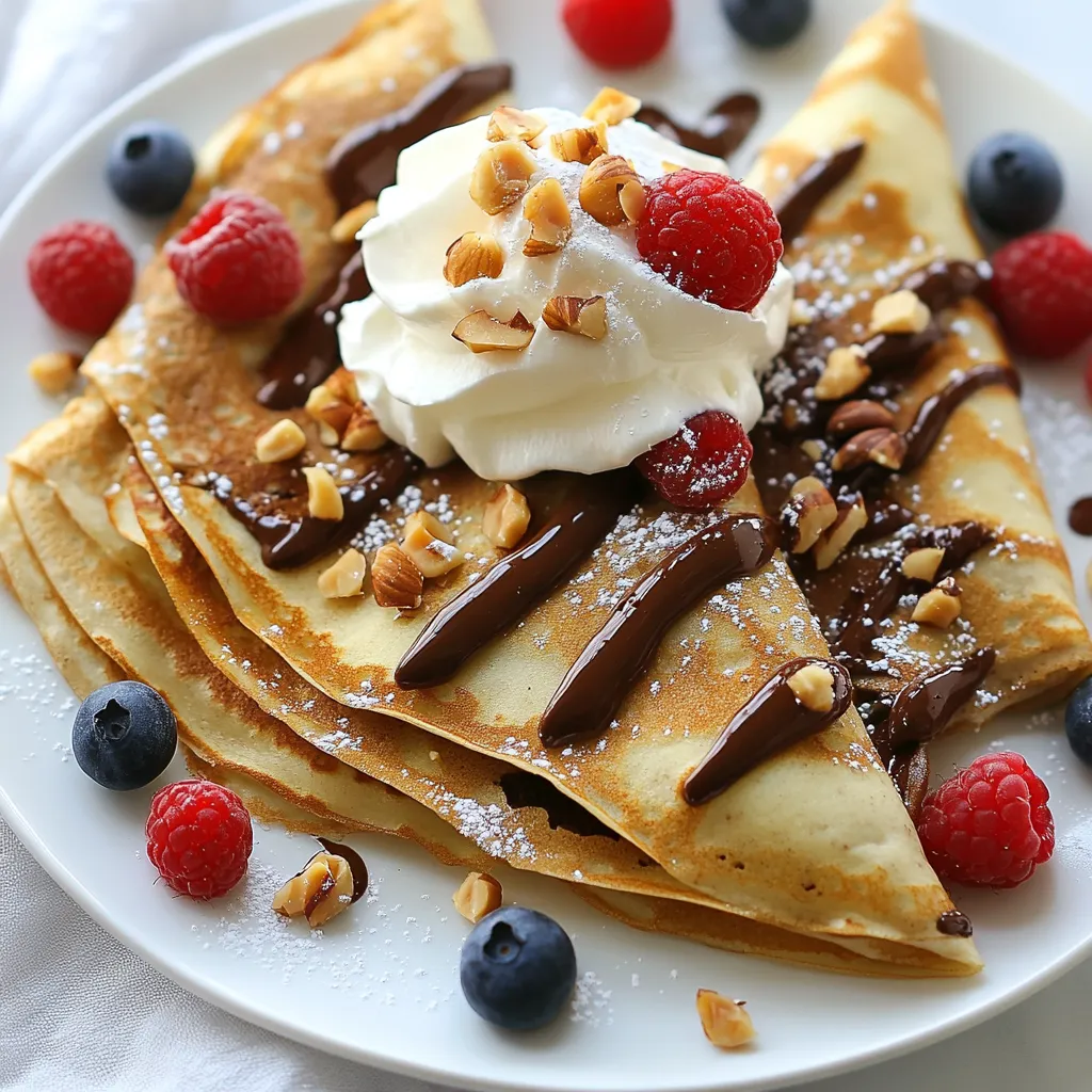 The star of this recipe is the chocolate hazelnut spread, which adds a rich, sweet filling. Crushed hazelnuts give a nice crunch on top. Whipped cream and fresh berries can make your dish look pretty and add extra flavor. Enjoy making these tasty crepes!