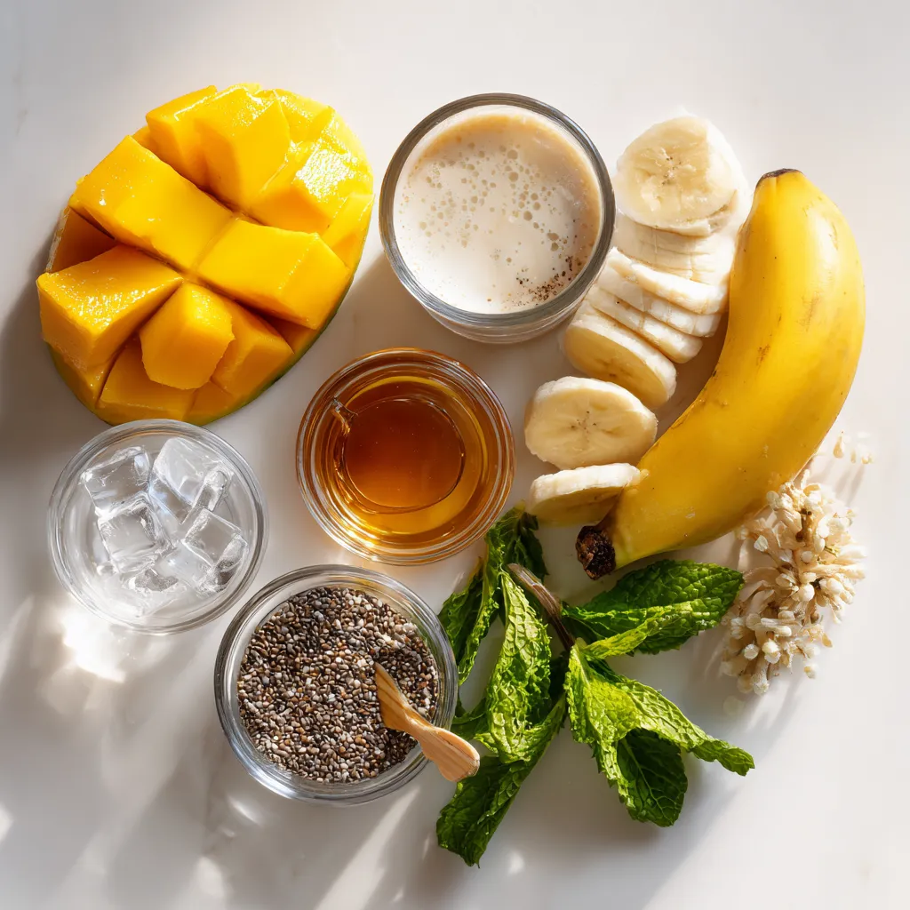 Finally, fresh mint leaves can brighten your smoothie. They add a nice touch when you serve it. These ingredients come together to make a drink that is both refreshing and nutritious. Enjoy preparing your smoothie with these simple, wholesome ingredients!