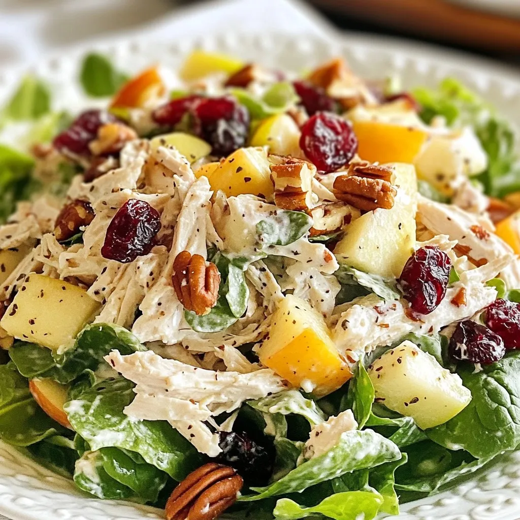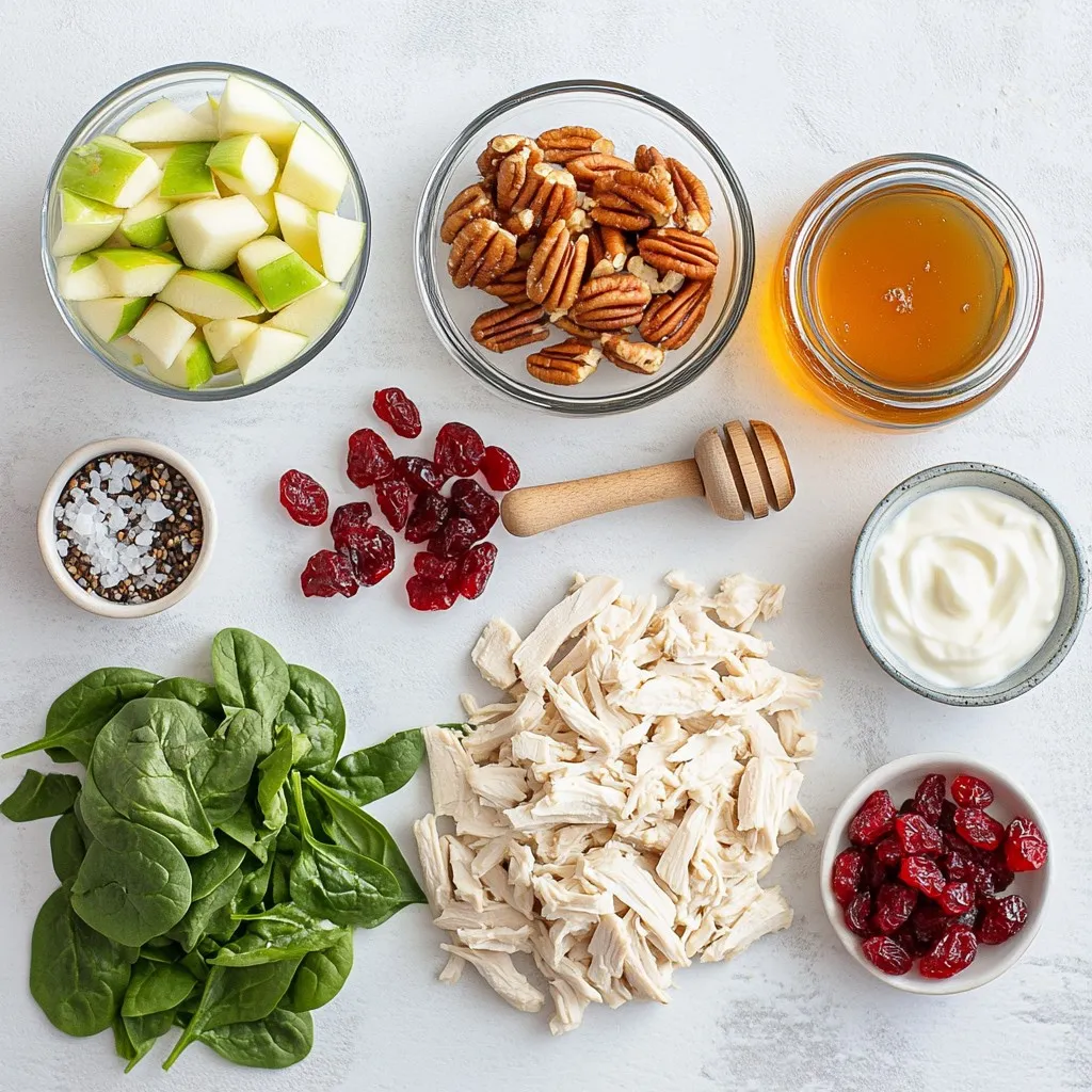 These main ingredients create a mix of flavors and textures. The shredded chicken gives protein and heartiness. Fresh spinach adds a bright color and healthy greens. Dried cranberries bring a sweet and tart flavor. Toasted pecans add a nice crunch. Diced apples add sweetness and freshness.