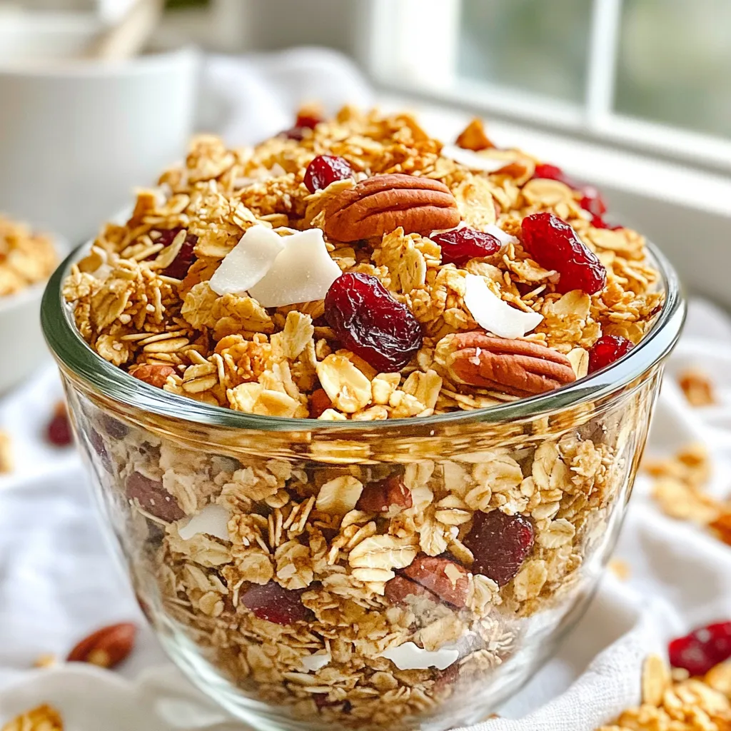 Cranberry Pecan Granola is easy to make with healthy ingredients. You mix oats, pecans, and cranberries with a sweet blend of honey or maple syrup. Bake your mixture until golden and store it for snacking.