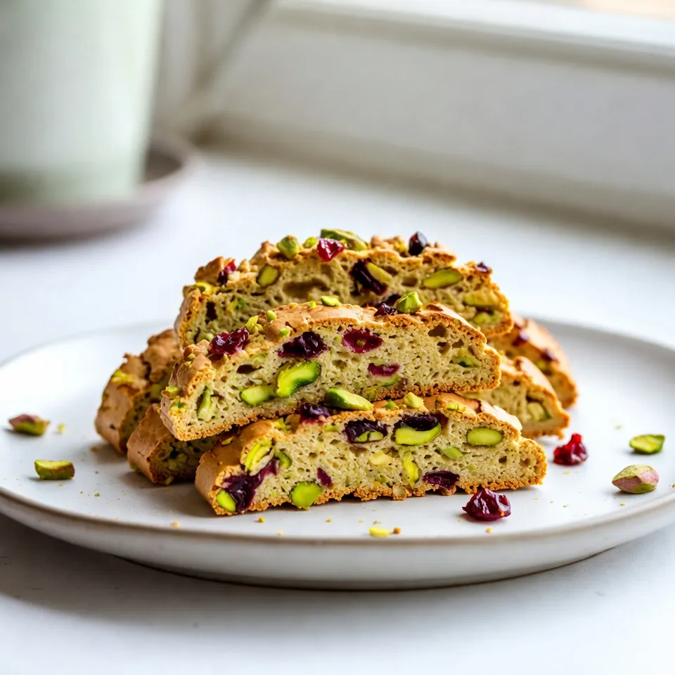 - 2 cups all-purpose flour - 1 teaspoon baking powder - 1/2 teaspoon salt - 1/2 cup unsalted butter, softened - 3/4 cup granulated sugar - 2 large eggs - 1 teaspoon vanilla extract - 1 cup dried cranberries - 1 cup pistachios, shelled and roughly chopped - Chopped pistachios for garnish - Chocolate or caramel sauce for dipping To create cranberry pistachio biscotti, start with these simple ingredients. All-purpose flour forms the base. Baking powder helps them rise. Salt adds a touch of flavor. Use softened unsalted butter for a creamy texture. Granulated sugar adds sweetness. Eggs give the biscotti structure. Vanilla extract brings warmth and depth. Dried cranberries provide tartness and color. Finally, pistachios add a lovely crunch. If you want to dress up your biscotti, consider adding toppings. Chopped pistachios make a great garnish. You can also serve them with chocolate or caramel sauce for dipping. This extra touch makes them even more fun to enjoy! {{ingredient_image_1}} First, I preheat my oven to 350°F (175°C). I line a baking sheet with parchment paper. This helps the biscotti not stick. Next, I grab a mixing bowl. I whisk together 2 cups of all-purpose flour, 1 teaspoon of baking powder, and 1/2 teaspoon of salt. This mix gives the biscotti structure. In another large bowl, I cream together 1/2 cup of softened unsalted butter and 3/4 cup of granulated sugar until it looks light and fluffy. Now I beat in 2 large eggs, one at a time. After that, I add 1 teaspoon of vanilla extract. I mix well after each egg. This step adds moisture and flavor. Next, I gradually combine the dry ingredients with the wet mix. I fold in 1 cup of dried cranberries and 1 cup of roughly chopped pistachios. The cranberries give a sweet-tart taste, while the pistachios add crunch. I transfer the dough onto a lightly floured surface. I shape it into a log, about 12 inches long and 3 inches wide. I place this log on the prepared baking sheet and slightly flatten the top. After that, I bake it in the preheated oven for about 25-30 minutes. I want it to be lightly golden and firm to the touch. Once done, I let it cool for 15 minutes. Next, I carefully transfer the log to a cutting board. I slice it diagonally into 1/2-inch thick pieces. I arrange the slices cut-side down back on the baking sheet. I bake them again for 10-15 minutes. This makes the biscotti crispy and golden. After baking, I let them cool completely on a wire rack. To get that perfect crispiness in your biscotti, you must bake them twice. The first bake creates the shape, while the second bake firms them up. Keep an eye on the color. You want them golden, not brown. To avoid overly dry biscotti, do not overbake them during the second round. Check them around the 10-minute mark. They should feel hard but not rock-like. If they cool and feel too hard, they will stay that way. You can boost the taste of your biscotti by adding spices like cinnamon or nutmeg. A splash of almond extract also works well. These spices will add warmth and depth to the flavor. If you want to try different nuts, almonds or walnuts can be great options. Each nut offers its unique twist, making your biscotti even more special. Just chop them up, and you’re good to go! Biscotti pairs well with coffee or tea. A rich hot chocolate also makes a great match. For a festive touch, serve them with a splash of eggnog during the holidays. For presentation, arrange the biscotti in a decorative container. You can even add a small dish of chocolate or caramel sauce for dipping. A sprinkle of chopped pistachios on top adds a lovely finish. Pro Tips Chill the Dough: For easier handling, refrigerate the dough for 30 minutes before shaping it into a log. Use Fresh Nuts: Toast pistachios lightly before adding them for enhanced flavor and crunch. Slice with Care: Use a serrated knife to slice the biscotti for a clean cut without crumbling. Double Bake for Crispiness: Ensure your biscotti are truly crisp by returning them to the oven for a second bake. {{image_2}} You can play with flavors in your cranberry pistachio biscotti. Adding chocolate gives a rich twist. Simply fold in 1 cup of chocolate chips with the cranberries and pistachios. This makes for a delightful mix of tart and sweet. Another great idea is to add orange zest. Grate the peel of one orange and mix it into your dough. This adds a bright, citrus flavor that pairs well with the cranberries. The fresh scent will lift your spirits as you bake. If you want a gluten-free version, use a gluten-free flour blend. Many brands offer great options that work well in biscotti. Just substitute the all-purpose flour with the same amount of the gluten-free blend. For a healthier treat, consider sugar replacements. You can use coconut sugar or a sugar substitute like stevia. Just keep in mind that not all substitutes measure the same as granulated sugar. Adjust the amount based on the package instructions for the best results. To keep your cranberry pistachio biscotti fresh, store them in an airtight container. This will help maintain their crunch. You can use a cookie jar, a plastic container, or even a zip-top bag. Place a piece of parchment paper between layers to prevent sticking. Store them at room temperature, away from direct sunlight. You can freeze biscotti to enjoy later. To freeze, first let the biscotti cool completely. Then, wrap them in plastic wrap tightly. Place them in a freezer-safe bag or container. Make sure to remove as much air as possible. For the best quality, eat them within three months. To thaw, take them out of the freezer and leave them at room temperature. They will regain their crunch after a short time. If you want, you can heat them in the oven for a few minutes. This will make them even more delicious! How long do biscotti last? Biscotti can last for about two weeks when stored in an airtight container. They stay fresh and crunchy during this time. For longer storage, you can freeze them for up to th