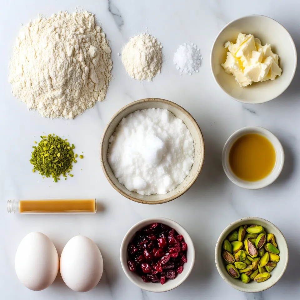 To create cranberry pistachio biscotti, start with these simple ingredients. All-purpose flour forms the base. Baking powder helps them rise. Salt adds a touch of flavor. Use softened unsalted butter for a creamy texture. Granulated sugar adds sweetness. Eggs give the biscotti structure. Vanilla extract brings warmth and depth. Dried cranberries provide tartness and color. Finally, pistachios add a lovely crunch.