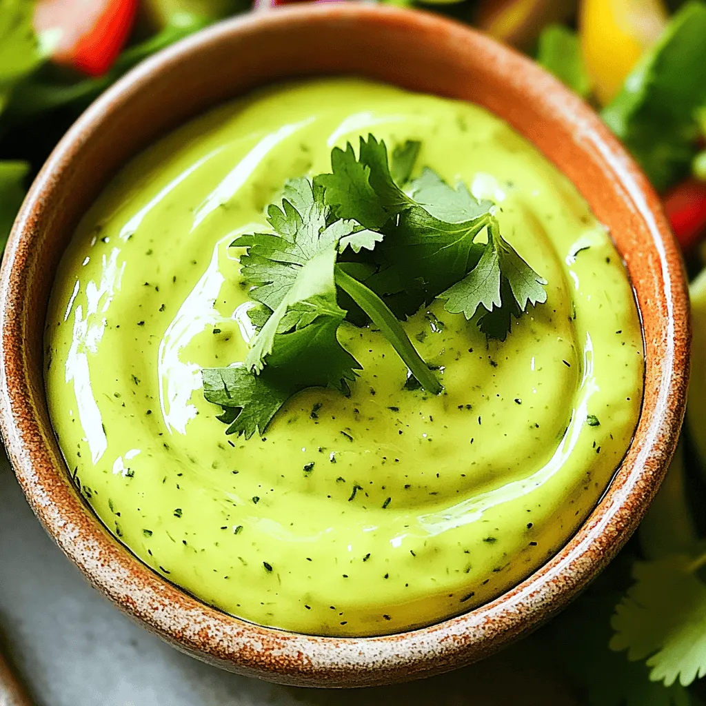 To make your creamy avocado cilantro dressing, you will need the following simple ingredients: - 1 ripe avocado - 1/4 cup fresh cilantro leaves, tightly packed - 2 tablespoons Greek yogurt (or a plant-based yogurt) - 1 tablespoon lime juice - 1 garlic clove, minced - 1/4 teaspoon cumin powder - Salt and pepper to taste - Water (as needed for consistency) These ingredients blend together to create a creamy and tasty dressing. The ripe avocado gives it a smooth texture. Fresh cilantro adds a bright flavor that really pops. Greek yogurt makes it creamy and rich, while lime juice brings in a nice tang. The garlic and cumin give it depth and warmth. Make sure to choose a ripe avocado. A ripe avocado feels slightly soft when you press it. If it’s too hard, it needs more time to ripen. Fresh cilantro should look vibrant and green. Avoid any yellow or wilting leaves. Gather all your ingredients before you start. This makes the process easier and faster. You will love how quick and simple it is to whip up this dressing. 1. Start by cutting the avocado in half. Remove the pit carefully. Use a spoon to scoop the green flesh into your food processor or blender. 2. Next, add the fresh cilantro leaves to the processor. Include the Greek yogurt, lime juice, minced garlic, and cumin powder. 3. Blend the mixture on high until it is smooth. It should have a creamy texture. 4. If the dressing is too thick, add water. Do this one tablespoon at a time. Blend again until you reach your desired consistency. 5. Now, season the dressing with salt and pepper. Blend once more to mix it well. 6. Transfer the creamy dressing to a jar or airtight container. Refrigerate for at least 30 minutes. This helps the flavors blend together nicely. This simple process creates a rich and tasty dressing. Enjoy your delicious creation! Choosing the right avocado Pick a ripe avocado. It should be slightly soft but not mushy. A ripe avocado gives the best creaminess to your dressing. If it feels hard, let it ripen on the counter for a few days. Check it daily. Tips for flavor enhancement Add a bit more lime juice for zing. You can also try adding a pinch of chili powder for heat. If you want a deeper flavor, roast the garlic before adding it. This will give the dressing a sweet and rich taste. Blending techniques for a smoother texture Use a good blender or food processor. Start blending on low and then increase the speed. If the dressing is thick, add water slowly. Blend until everything is smooth and creamy. Scrape the sides of the bowl to mix all ingredients well. {{image_2}} You can change up this creamy avocado cilantro dressing to fit your taste. Here are a few easy swaps: - Alternative yogurt options: If you want a dairy-free version, try using coconut yogurt or almond yogurt. Both add a nice creaminess without the dairy. - Adding spices or herbs for different flavors: For a kick, add a pinch of cayenne or smoked paprika. You can also mix in fresh herbs like parsley or dill for a new twist. - Using different citrus juices: Lime juice gives a fresh taste, but lemon juice works well too. If you want something sweeter, try orange juice for a fun flavor change. Feel free to mix and match these swaps to create your perfect dressing! To keep your creamy avocado cilantro dressing fresh, use an airtight container. Glass jars work great. They seal well and do not stain. You can also use plastic containers with tight lids. This dressing lasts for about three to five days in the fridge. The lime juice helps slow down browning, but it will still change color. If it turns brown, it’s still safe to eat. Just give it a good stir. Freezing this dressing is not ideal. It can change texture and become watery. If you must freeze it, use ice cube trays. This way, you can thaw only what you need later. Just remember, the flavor may not be as bright after freezing. Can I make this dressing vegan? Yes, you can make this dressing vegan. Just swap Greek yogurt for a plant-based yogurt. This simple change keeps the creaminess while staying dairy-free. How long does homemade dressing last? Homemade dressing lasts about five days in the fridge. Store it in an airtight container for the best results. If you notice any changes in smell or color, it's best to toss it. What dishes pair well with this dressing? This dressing shines on salads and grain bowls. It also works great as a dip for fresh veggies. You can even drizzle it over tacos or grilled meats for extra flavor. This post shared how to make a creamy avocado cilantro dressing. We covered simple ingredients and step-by-step instructions. You learned how to pick the right avocado and adjust the taste. Tips on storing and ingredient swaps also helped you customize your dressing. In conclusion, enjoy this fresh dressing on salads, tacos, or bowls. It adds flavor and nutrition to any meal. With these easy steps, you can impress your family and friends. Get ready to blend your way to delicious meals!