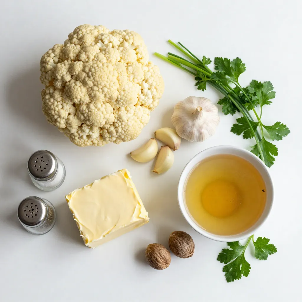 For this creamy garlic mashed cauliflower, we start with fresh, crisp cauliflower. You need one large head. Cut it into florets for even cooking. Next, we use four cloves of garlic. Mince them well; this adds a rich flavor.
