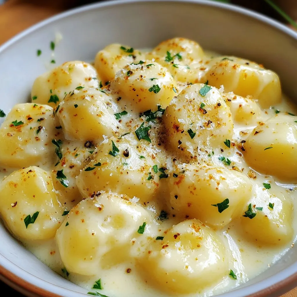 A delicious and creamy dish featuring potato gnocchi tossed in a garlic Parmesan sauce.