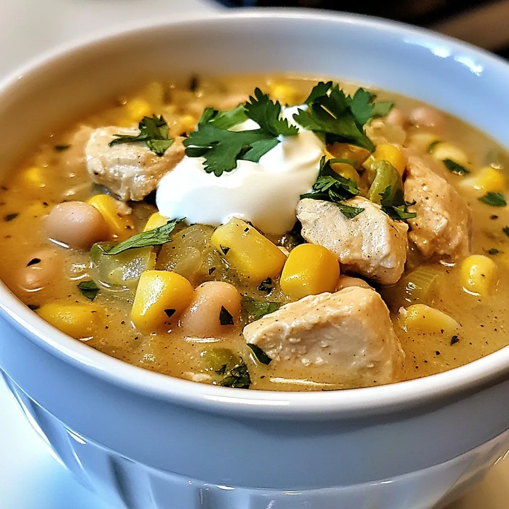 Now, it’s time to mix in the white beans, diced green chilies, and chicken broth. Add ground cumin, smoked paprika, and oregano. Stir everything together and bring it to a boil. After that, reduce the heat to low. Let your chili simmer for about 15 to 20 minutes. This lets all the flavors blend nicely. Finally, add the corn and heavy cream or coconut cream. Stir well and heat through for another 5 minutes. Don’t forget to season it with salt and pepper to taste. Now you’re ready to serve!
