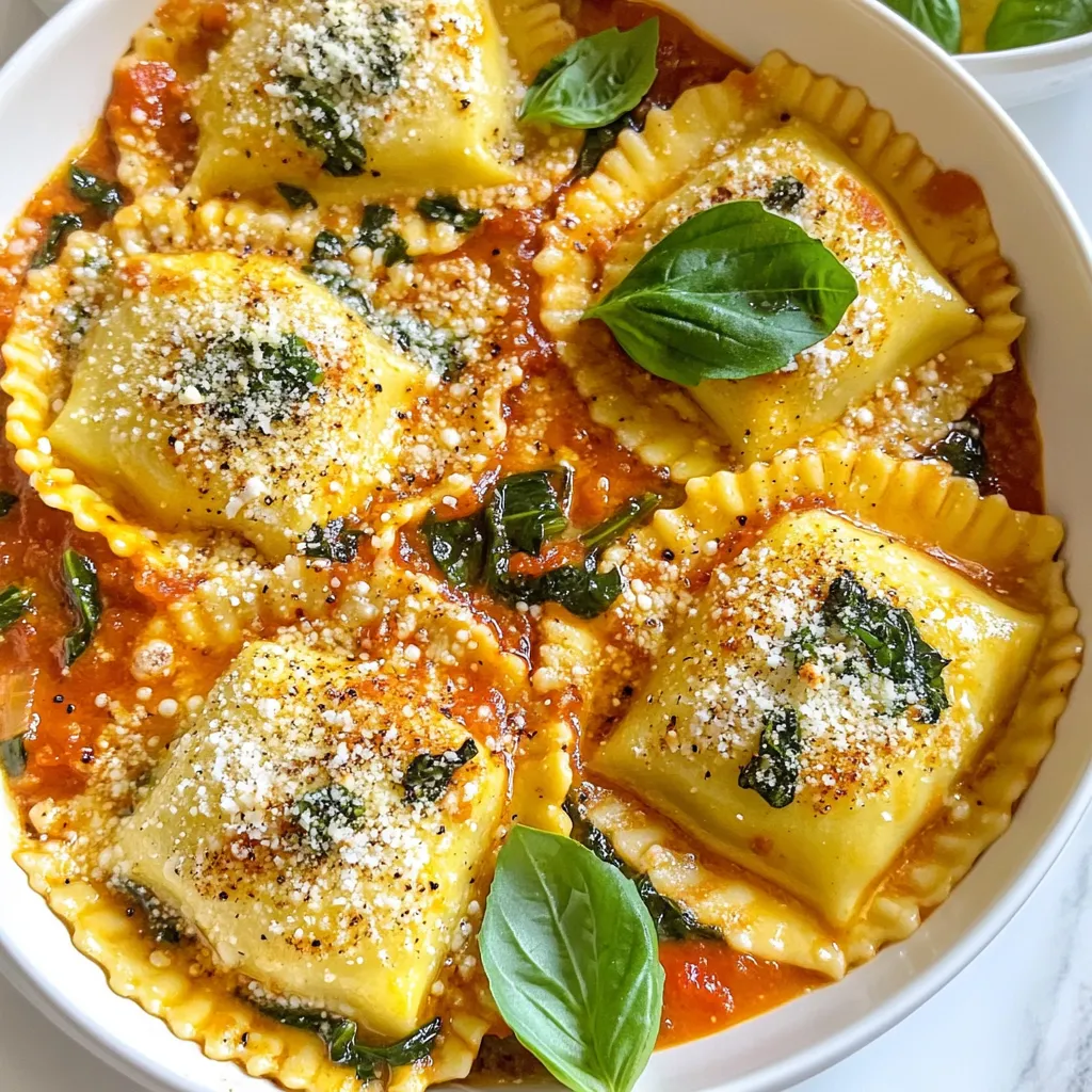 • Garnish and Present: Serve the ravioli in bowls, garnished with fresh basil leaves and an extra sprinkle of Parmesan if desired.