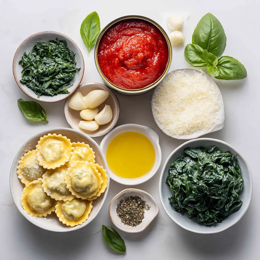 A delicious and creamy pasta dish featuring ravioli, fresh spinach, and a rich tomato sauce.
