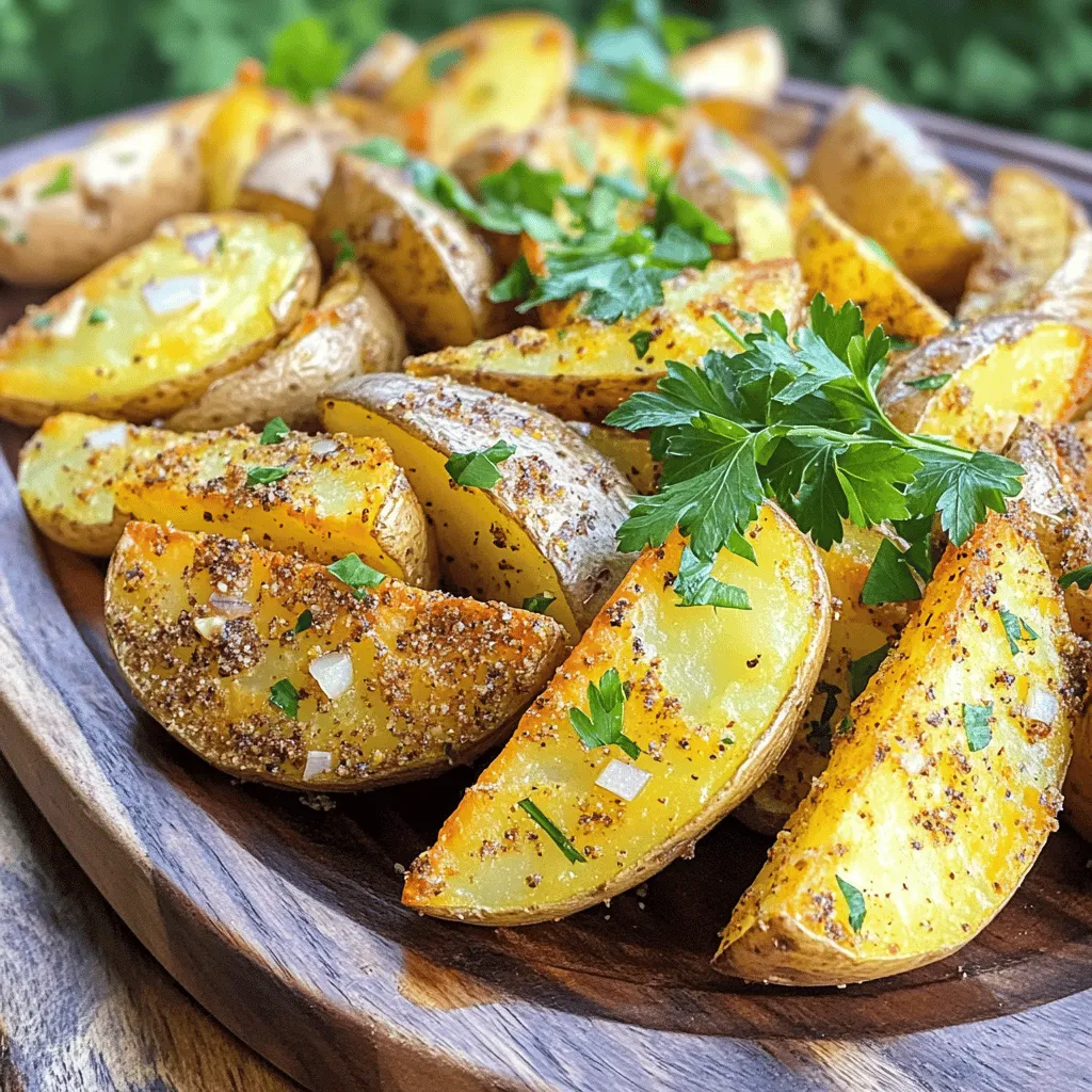 To make crispy ranch potato wedges, you need: - 4 medium russet potatoes, cut into wedges - 2 tablespoons olive oil For the perfect taste, gather these seasonings: - 1 packet (1 ounce) ranch seasoning mix - 1 teaspoon garlic powder - 1 teaspoon onion powder - 1/2 teaspoon paprika - 1/2 teaspoon salt Add a bright touch with: - Fresh parsley, chopped First, wash the russet potatoes well. Clean them to remove any dirt. Next, cut each potato into wedges. Aim for about eight wedges from each potato. Place the wedges in a large bowl. This helps keep things neat as you cook. In a separate bowl, mix together the olive oil and ranch seasoning. Add the garlic powder and onion powder for extra flavor. Then, sprinkle in the paprika and salt. Stir well until everything is combined. This mixture will give the wedges a tasty kick. Preheat your air fryer to 400°F (200°C). This takes about five minutes. Next, take the seasoned potato wedges and arrange them in the fryer basket. Make sure they are in a single layer. Avoid overlap to get them crispy. Cook the wedges for 15 to 20 minutes. Shake the basket halfway through to help them cook evenly. They should come out golden brown and crispy. Once done, let them cool for a minute. Finally, garnish with fresh parsley before serving. Enjoy these tasty bites! To get your potato wedges extra crispy, follow these steps. First, soak the cut wedges in cold water for at least 30 minutes. This helps remove excess starch. Then, dry them well with a clean towel. The drier the potatoes, the crispier they will get. Coat them evenly with olive oil and seasoning. Avoid overcrowding the air fryer. Cook in batches if needed. This allows hot air to circulate around each wedge. For bold flavor, use a good ranch seasoning mix. I prefer to mix my own for freshness. Combine garlic powder, onion powder, paprika, and salt with the ranch. Toss the wedges well to coat evenly. Taste a small piece before cooking. Adjust the seasoning if needed. Fresh parsley adds a nice touch after cooking. It brightens the dish and adds color. Keep your air fryer clean for best results. Wipe down the outside and inside after each use. Remove the basket and wash it with warm, soapy water. Make sure to dry it completely before putting it back. If you notice any smoke or burnt smell, check for leftover food particles. Regular maintenance keeps your air fryer working well and your food tasting great. {{image_2}} To make spicy ranch potato wedges, add heat. Use a spicy ranch seasoning mix or add cayenne pepper. Start with 1/4 teaspoon of cayenne. Mix it with the regular ranch seasoning. This adds flavor and kicks up the heat. Enjoy these wedges with a cooling dip. For cheesy ranch potato wedges, use cheese. Sprinkle shredded cheese on top before the last five minutes of cooking. Cheddar or pepper jack works well. The cheese will melt and create a gooey texture. This makes the wedges extra tasty and fun to eat. To create herb-infused potato wedges, mix fresh herbs into your seasoning. Try rosemary, thyme, or dill. Chop the herbs finely and add them to the oil and seasoning mix. This gives the wedges a fresh taste. You can also sprinkle herbs on top after cooking for a pop of color. You may have some crispy ranch potato wedges left after a meal. To store them, let them cool down first. Place them in an airtight container. They will stay fresh for about 2-3 days in the fridge. Make sure they are not stacked on top of each other to avoid sogginess. When you want to eat your leftover wedges, reheating is key. The best way to do this is in the air fryer. Preheat your air fryer to 350°F (175°C). Place the potato wedges in a single layer. Heat them for about 5-7 minutes. This will help them regain their crispiness. If you want to save your wedges for later, freezing is a good option. First, let them cool completely. Spread them out on a baking sheet in a single layer. Place the sheet in the freezer for about 1-2 hours. Once they are frozen, transfer them to a freezer-safe bag. They can last up to 2 months in the freezer. When ready to eat, cook them straight from frozen in the air fryer for about 15-20 minutes. Yes, you can use other potatoes. Yukon gold and sweet potatoes work well. These types offer different flavors. Yukon gold gives a creamy taste, while sweet potatoes add sweetness. Just remember to cut them into wedges, like russet potatoes. You can bake them in the oven. Preheat the oven to 425°F (220°C). Spread the wedges on a baking sheet in one layer. Bake for 25-30 minutes, flipping halfway. Watch for golden brown edges to know when they are done. This method still gives you a nice crisp! Several dips go great with these wedges. Ranch dressing is a classic choice. You can also try ketchup for a sweet kick. For a spicy twist, use sriracha mayo. Garlic aioli is another tasty option. Each dip enhances the flavor of your crispy ranch potato wedges! We explored how to make crispy ranch potato wedges from start to finish. You learned about key ingredients, step-by-step cooking, and handy tips for great results. We also covered tasty variations and how to store leftovers. In the end, you have all the tools to create delicious potato wedges at home. Enjoy experimenting with flavors and make this dish your own!