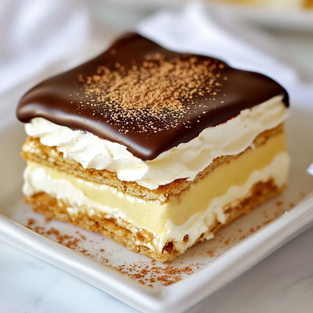 To make a wonderful Eggnog Eclair Cake, you will need these key ingredients: - 1 box of instant vanilla pudding mix (3.4 oz) - 2 cups milk - 1 teaspoon ground nutmeg - 1/2 teaspoon ground cinnamon - 1 teaspoon vanilla extract - 1 container of whipped topping (8 oz) - 1 package of graham cracker sheets (14.4 oz) - 1 cup eggnog (non-alcoholic) - 1 cup semi-sweet chocolate chips - 2 tablespoons butter These ingredients create a creamy and dreamy dessert. The instant vanilla pudding mix gives a rich base, while the eggnog adds a festive flavor. Nutmeg and cinnamon bring warmth to each bite. You can make your Eggnog Eclair Cake even more special with some simple garnishes: - Extra ground nutmeg for sprinkling on top - Whipped cream for a fluffy touch - Crushed graham crackers for added texture - Chocolate shavings for a fancy look These garnishes not only enhance the look but also add more flavor. If you need to make some swaps, here are a few easy substitutes: - Use almond milk instead of regular milk for a dairy-free option. - Swap vanilla pudding mix with chocolate for a different taste. - Replace whipped topping with coconut cream for a vegan choice. - Use any milk alternative for eggnog if you prefer. These substitutes keep the dish tasty while meeting your dietary needs. {{ingredient_image_1}} First, grab a large mixing bowl. Add 1 box of instant vanilla pudding mix and 2 cups of milk. Whisk them together for about 2 minutes. You want the mixture to thicken nicely. Next, stir in 1 teaspoon of ground nutmeg, 1/2 teaspoon of ground cinnamon, and 1 teaspoon of vanilla extract. This adds that classic eggnog flavor. Once combined, gently fold in 1 container of whipped topping. Make sure there are no lumps left. This creates a smooth and creamy pudding. Now it’s time to build your cake. Start by dipping each graham cracker sheet in 1 cup of eggnog. Just a quick dip is enough. Let the extra eggnog drip off. In a 9x13 inch baking dish, place a layer of the dipped graham crackers at the bottom. Make sure to cover the entire base. Spread half of the pudding mixture over the crackers. Then, repeat the process with another layer of eggnog-dipped crackers and the rest of the pudding mixture. Finish with one more layer of graham crackers on top. Let’s make the chocolate ganache now. In a microwave-safe bowl, combine 1 cup of semi-sweet chocolate chips and 2 tablespoons of butter. Microwave them in 30-second intervals. Stir between each interval until the mixture is smooth. Once melted, pour the ganache over the top layer of graham crackers. Spread it evenly for a nice finish. Finally, chill the cake in the refrigerator for at least 4 hours, or overnight if you can wait. This helps it set perfectly, making each slice a delight. To truly bring out the rich taste of eggnog, use fresh nutmeg. Ground nutmeg can lose its flavor over time. I suggest grating whole nutmeg for the best results. Also, don't skip the vanilla extract. It adds depth to the pudding. The mix of cinnamon and nutmeg creates a warm and cozy flavor. Store your Eggnog Éclair Cake in the fridge. Cover it well with plastic wrap. This keeps it fresh and prevents it from drying out. It can last for about 3 days. If you want to keep it longer, consider freezing it. For a festive touch, serve slices on holiday-themed plates. You can sprinkle extra nutmeg on top for color. This cake pairs well with a cup of warm cocoa or coffee. For added fun, consider serving it with whipped cream on the side. It makes a lovely treat for family gatherings and holiday parties. Pro Tips Use Fresh Eggnog: For the best flavor, opt for fresh, high-quality eggnog instead of powdered or carton versions. Chill Time Matters: Letting the cake chill overnight allows the flavors to meld and enhances the texture, making it creamier. Graham Cracker Tips: Dip graham crackers quickly in eggnog to prevent them from becoming too soggy; a quick dip is sufficient. Chocolate Ganache Consistency: Ensure the chocolate ganache is smooth and pourable by melting at intervals and stirring thoroughly. {{image_2}} You can make a vegan version of Eggnog Éclair Cake. Use a plant-based milk, like almond or oat milk, instead of regular milk. Choose a dairy-free whipped topping. You may find vegan pudding mixes, or you can make your own. Use cornstarch, almond milk, and a bit of sugar to create a creamy base. This way, you can still enjoy the festive flavors without dairy. Want to switch things up? Try adding pumpkin spice! Just replace the nutmeg and cinnamon in the pudding mix with 1 tablespoon of pumpkin spice. This adds a warm and cozy feel. You can also use flavored extracts like almond or peppermint for a twist. Each option gives your cake a unique taste while keeping the festive spirit alive. Get creative with the toppings! You can use crushed graham crackers for a crunchy layer on top. Toasted coconut adds a tropical touch. For a burst of flavor, add a layer of caramel sauce before the chocolate ganache. You can even top it with fresh berries or a sprinkle of holiday sprinkles for color. Each topping makes the cake your own! To keep your Eggnog Éclair Cake fresh, store it in the fridge. Make sure to cover it with plastic wrap or foil. This helps to keep it moist and tasty. The cake can last up to five days in the fridge. If you follow these steps, you will enjoy it longer. You can freeze this cake for up to two months. First, wrap it tightly in plastic wrap. Then, place it in a freezer-safe container. This keeps the flavors intact. When you are ready to eat, let it thaw in the fridge overnight. This will help it regain its texture. If you want to enjoy it warm, gently reheat individual slices in the microwave. Set it for 15 to 30 seconds on low power. This warms it without ruining the creaminess. Avoid reheating the whole cake, as it may lose its texture. Always serve it cold or slightly warm for the best taste. Yes, you can use homemade pudding. Just make sure it is thick and c
