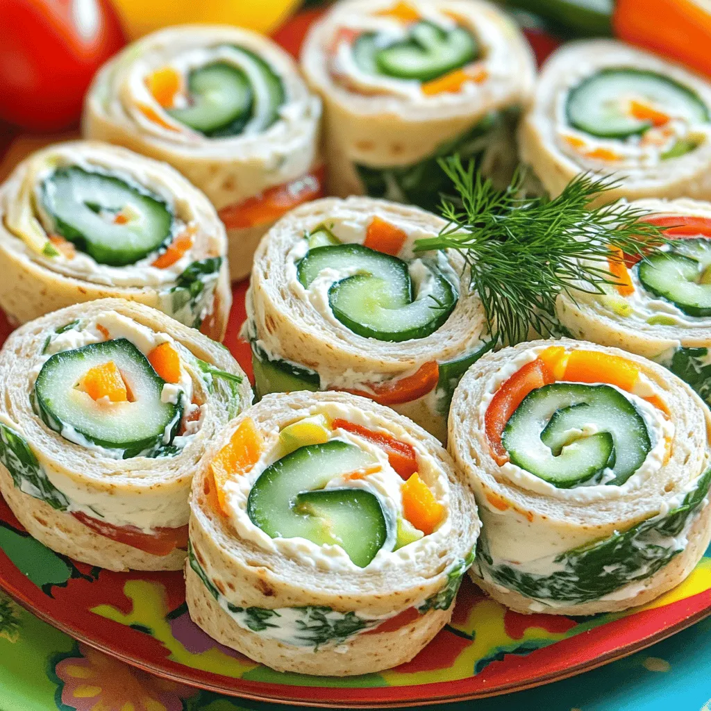 These ingredients make a bright and tasty snack. The cream cheese gives a creamy base. Garlic powder and dill add flavor. Fresh veggies bring crunch and color. You can use any bell pepper you like. Slicing the cucumber thinly helps with rolling. Grated carrot adds sweetness. Cherry tomatoes add juiciness. Salt and pepper balance the flavors. If you like heat, sprinkle red pepper flakes on top.