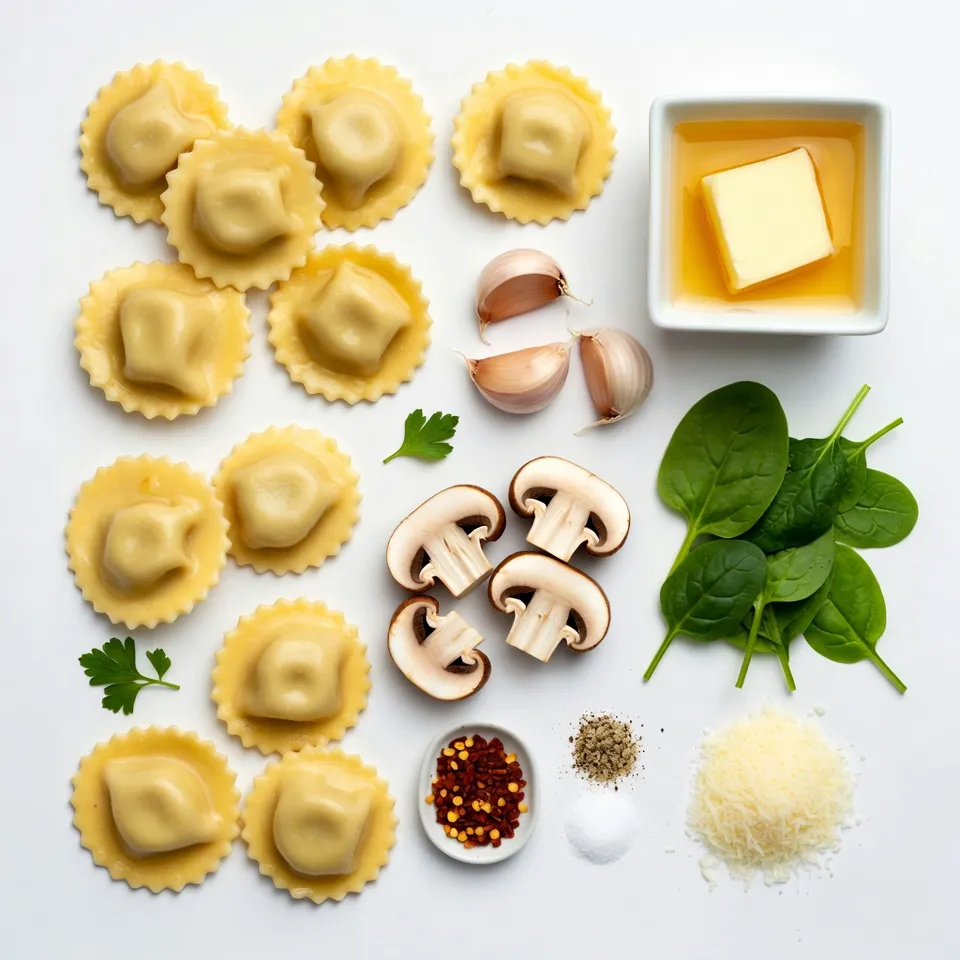 For this dish, I love using fresh or frozen mushroom ravioli. The pasta is soft and fills your mouth with flavor. Unsalted butter adds richness, and minced garlic brings a strong taste. I often use cremini mushrooms for their earthy flavor. Spinach leaves add a nice green touch.