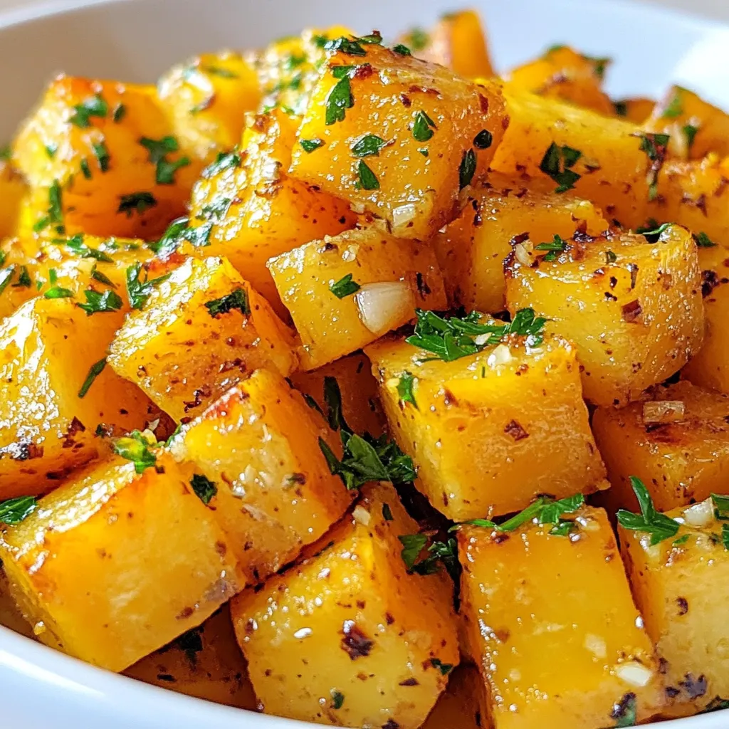 To make Garlic Herb Roasted Pumpkin, gather these simple ingredients: - Medium-sized pumpkin - Garlic cloves - Olive oil - Dried thyme - Dried rosemary - Dried oregano - Salt and pepper - Fresh parsley for garnish These ingredients create a tasty dish that highlights the pumpkin's natural sweetness. The garlic adds a bold flavor, while the herbs give it depth. Olive oil helps everything roast evenly and brings out the best flavors. When selecting a pumpkin, look for one that feels heavy for its size, with a firm skin. This ensures your pumpkin is fresh and full of flavor. Feel free to experiment with different herbs or add spices based on your taste. Each choice can change the dish in fun ways! {{ingredient_image_1}} First, preheat your oven to 400°F (200°C). This temperature helps the pumpkin roast evenly. A hot oven gives your pumpkin that nice golden color and soft texture. While the oven heats, prepare your baking sheet. Line it with parchment paper. This step prevents sticking and makes cleanup easy. Next, you need to peel and dice the pumpkin. Start by cutting off the top and bottom of the pumpkin. Then, use a sharp knife to peel off the skin. Be careful, as pumpkin can be tough. After peeling, cut the pumpkin into halves. Scoop out the seeds and stringy bits with a spoon. Cut the halves into cubes, about one inch each. Try to keep the sizes uniform. This way, they will roast evenly. In a large bowl, combine the diced pumpkin with minced garlic, olive oil, thyme, rosemary, oregano, salt, and pepper. It's important to mix well. This ensures every piece of pumpkin gets coated with the tasty herbs and oil. You want that rich flavor in every bite. Spread the seasoned pumpkin in a single layer on the prepared baking sheet. Make sure the pieces are not touching. This helps them roast instead of steam. Roast the pumpkin for 25-30 minutes. Halfway through, turn the pieces over. This action helps them brown evenly on all sides. You’ll know they are done when they are tender and golden brown. To know when your pumpkin is done, look for a golden brown color. The pieces should be tender. You can check this by poking them with a fork. If they fall apart easily, they are ready. Roast time may change based on the size of your pumpkin cubes. Smaller cubes cook faster, while larger ones need more time. If your cubes are thick, plan for an extra 5–10 minutes. To boost flavor, consider adding more herbs. Fresh thyme or basil can add a nice touch. You can also sprinkle on some red pepper flakes for a little heat. Drizzling balsamic glaze over the roasted pumpkin adds a sweet and tangy flavor. You can also use a little honey or maple syrup for a sweet twist. Garlic herb roasted pumpkin pairs well with grilled chicken or fish. It also goes great with quinoa or rice dishes. You can serve it alongside a fresh salad for a light meal. For a seasonal touch, serve it with other fall favorites like roasted Brussels sprouts or sweet potatoes. This dish fits perfectly on your holiday table, bringing warmth and flavor to any meal. Pro Tips Use Fresh Herbs: Fresh herbs can elevate the flavor profile of your roasted pumpkin. If available, substitute dried herbs with fresh ones for a more vibrant taste. Perfect Cut Size: Ensure the pumpkin cubes are evenly sized for consistent cooking. Aim for about 1-inch cubes to achieve the perfect balance of tenderness and caramelization. Season Generously: Don’t be afraid to season your pumpkin well. A good amount of salt and pepper can significantly enhance the natural sweetness of the pumpkin. Experiment with Spices: Feel free to add other spices like paprika or cumin for a different flavor twist. Roasted pumpkin pairs well with a variety of spices. {{image_2}} You can roast many other vegetables like pumpkin. Sweet potatoes, carrots, and beets work well too. They all have great flavors when roasted. Mixing pumpkin with root vegetables brings a lovely mix of tastes. The sweetness of sweet potatoes pairs nicely with pumpkin. Try using equal parts pumpkin and sweet potatoes for a colorful dish. If you're vegan, this recipe works for you. Just use olive oil and skip any animal products. For gluten-free folks, this dish is already safe. If you want to skip garlic, try using shallots for a different flavor. You can also leave out the herbs or use fresh ones instead. Experiment with what you like best. You can take this dish in many directions. For a Mediterranean twist, add some lemon juice and feta cheese. This brightens the flavors and gives a fresh taste. If you want an Asian fusion, try soy sauce and sesame oil. Add chopped green onions for a pop of color and flavor. These ideas help you create dishes that fit your taste. To keep your garlic herb roasted pumpkin fresh, place it in an airtight container. Store it in the fridge for up to four days. Make sure it cools completely before sealing. This helps retain its taste and texture. You can freeze roasted pumpkin for longer storage. First, let it cool down. Then, spread the pumpkin on a baking sheet in a single layer. Freeze it for about an hour. Once frozen, transfer it to a freezer-safe bag. Label the bag with the date. It can last up to three months. When you're ready to use it, thaw the pumpkin in the fridge overnight. To reheat, place it in the oven at 350°F (175°C) until warmed through. This keeps the flavors intact and restores its texture. Leftover roasted pumpkin is versatile. You can add it to soups for creaminess and flavor. Just blend it into your favorite broth. You can also toss it into salads for a warm, hearty touch. For a creative twist, make pumpkin pasta sauce. Blend the roasted pumpkin with some garlic and cream. This adds a unique flavor to your dish. Don't forget to sprinkle some fresh herbs on top for extra taste! Roasting pumpkin takes about 25-30 minutes at 400°F (200°C). The time can change based on the thickness of your pumpkin cubes. If your pieces are bigger, they will need more time. Ke