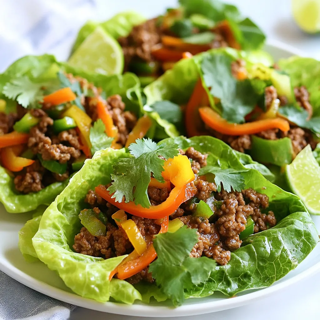 A delicious and healthy dish featuring seasoned ground beef served in crisp lettuce leaves.
