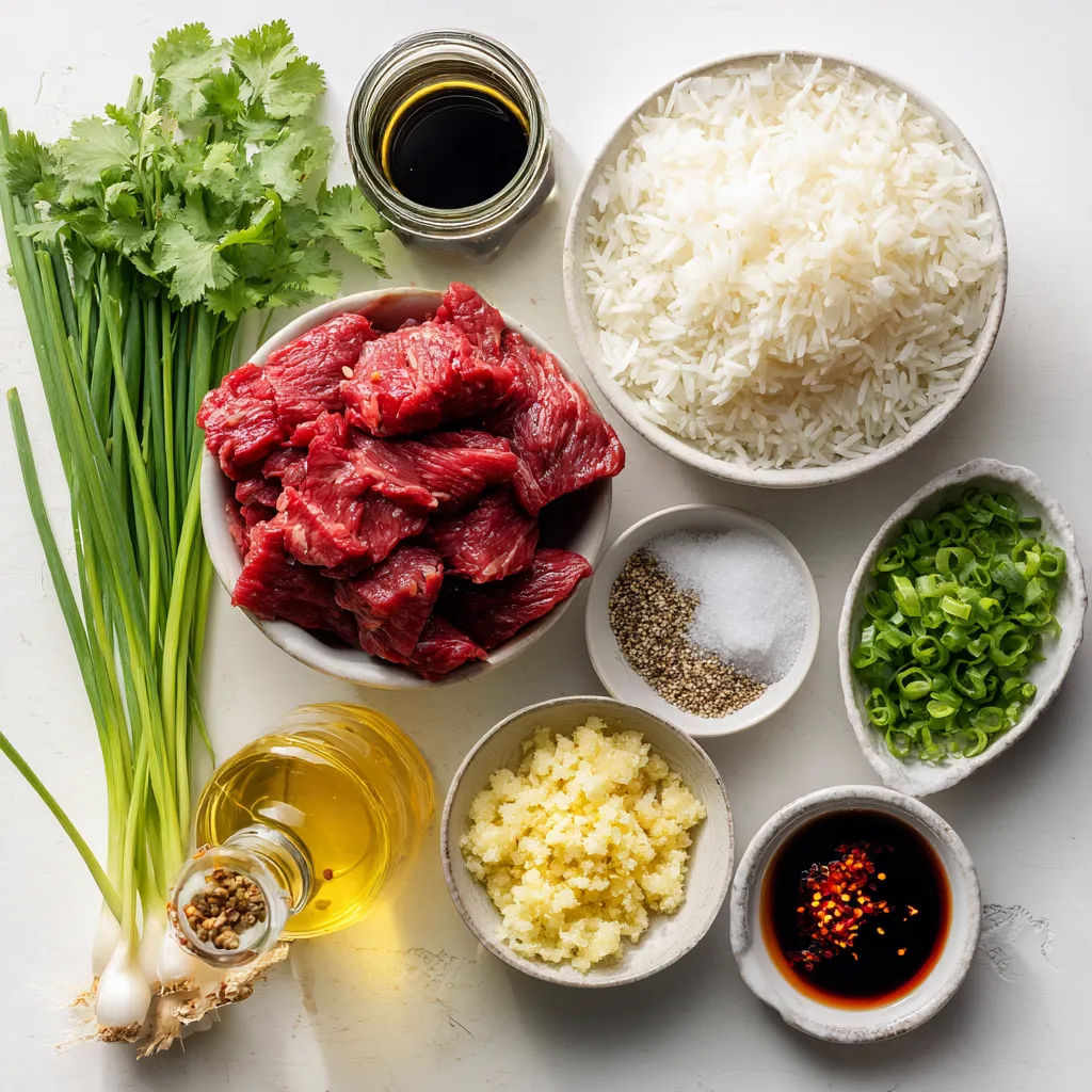 Now, return the beef to the skillet. Add the cooked jasmine rice, soy sauce, and sesame oil. Mix everything well. If you like heat, sprinkle in some red pepper flakes. Stir again for another 3-4 minutes. Make sure everything is heated through. Taste it and add more salt and pepper if needed. Serve hot, and don’t forget to garnish with fresh cilantro and extra scallions if you want. Enjoy your meal!
