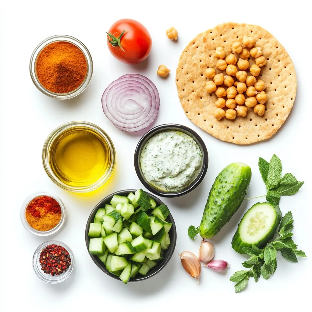 Each ingredient plays a role in creating a tasty and satisfying meal. The chickpeas give protein and texture. Olive oil adds richness and helps the spices stick. Dried oregano, garlic powder, onion powder, and smoked paprika give flavor and depth. The fresh veggies add crunch and brightness. Vegan tzatziki sauce brings creaminess and tang. Lastly, garnishes like parsley or mint add a fresh touch.