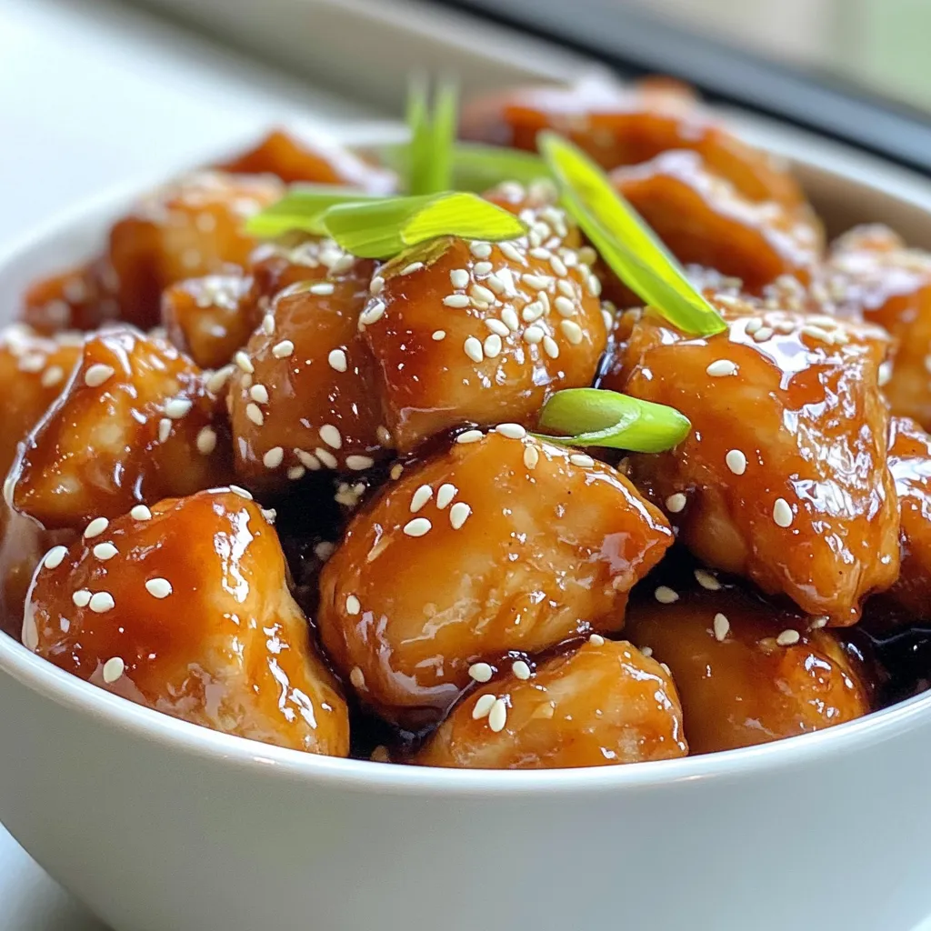 - 1 lb boneless, skinless chicken thighs, cubed - 3 tablespoons honey - 3 tablespoons soy sauce - 2 tablespoons sesame oil - 4 cloves garlic, minced - 1 tablespoon fresh ginger, grated - 2 teaspoons cornstarch - 1 tablespoon water - 3 tablespoons sesame seeds - 2 green onions, sliced - Salt and pepper to taste These main ingredients work together to create a sweet and savory dish. The chicken thighs are juicy and tender, making them perfect for this recipe. Honey adds sweetness, while soy sauce provides depth. Sesame oil gives a nice, nutty flavor. Garlic and ginger enhance the taste, making each bite amazing. You can add some optional ingredients to boost flavor: - Red pepper flakes for heat - Fresh cilantro for freshness - Broccoli or bell peppers for crunch Adding red pepper flakes brings a nice kick. Fresh cilantro adds bright notes. Vegetables like broccoli or bell peppers give texture and color. These extras make your meal even more exciting. Each serving contains: - Calories: 350 - Protein: 30g - Carbohydrates: 20g - Fat: 18g - Fiber: 1g This meal packs a good amount of protein, which helps keep you full. The carbs come mainly from honey and soy sauce. While it has some fat from sesame oil, it’s healthy fat. Enjoy this dish guilt-free! {{ingredient_image_1}} First, gather your ingredients. You will need 1 pound of boneless, skinless chicken thighs. Cut them into small cubes. This helps them cook evenly. The chicken thighs have great flavor and stay juicy. Next, make the marinade. In a bowl, mix 3 tablespoons of honey, 3 tablespoons of soy sauce, and 2 tablespoons of sesame oil. Add 4 cloves of minced garlic and 1 tablespoon of grated ginger. Stir until everything blends well. Now, add the cubed chicken to the bowl. Make sure all pieces are coated in the marinade. Let it sit for at least 30 minutes. If you have time, marinate it for up to 2 hours in the fridge. This adds deeper flavor. Heat a large skillet over medium-high heat. Once hot, add the marinated chicken and the marinade. Cook the chicken for 5-7 minutes. Stir regularly so it cooks evenly. You want it fully cooked and slightly caramelized. This gives it a nice color and taste. In a small bowl, mix 2 teaspoons of cornstarch with 1 tablespoon of water. Stir until smooth. Pour this mixture into the skillet with the chicken. Stir to combine everything. This will thicken your sauce. Cook for another 2-3 minutes until the sauce is nice and thick. Season the chicken with salt and pepper to taste. Then, sprinkle 3 tablespoons of sesame seeds over the top. Gently mix to distribute them. Now, you can remove it from heat and add sliced green onions for garnish. Enjoy your delicious Honey Garlic Sesame Chicken! To get the best flavor, marinate the chicken long enough. I suggest at least 30 minutes. If you can, let it sit for two hours. This gives the chicken time to soak up the honey, soy sauce, and garlic. Use fresh garlic and ginger for a stronger taste. They bring a bright and fresh flavor that dried spices just can't match. For cooking, use a large skillet. Heat it to medium-high before adding the chicken. This helps to caramelize the chicken and gives it a nice color. Stir often to cook the chicken evenly. If you want a bit of crunch, you can finish cooking it on high heat for a minute or two. This adds texture and makes the dish even better. Cornstarch is a great thickener, but there are others you can use. Arrowroot powder works well and is gluten-free. You can also use all-purpose flour for a different texture. Just mix it with water, like you do with cornstarch. If you want a rich flavor, try adding a little peanut butter to the sauce. It adds creaminess and a nutty taste that pairs well with the honey and garlic. Pro Tips Marination Time: Allow the chicken to marinate for at least 30 minutes, or up to 2 hours for a more intense flavor. Cooking Temperature: Ensure your skillet is hot before adding the chicken to achieve a nice caramelization. Thickening the Sauce: Mixing cornstarch with water before adding it to the skillet will create a smooth, thick sauce without lumps. Serving Suggestions: Serve this dish over steamed rice or with stir-fried vegetables for a complete meal. {{image_2}} You can easily add veggies to your honey garlic sesame chicken. Broccoli, bell peppers, and snap peas work great. Cut them into bite-sized pieces. When you cook the chicken, toss in the veggies during the last five minutes. This way, the veggies stay crisp and colorful. Plus, they soak up all that tasty sauce! If you like a bit of spice, you can tweak the recipe. Add red pepper flakes or sriracha to the marinade. Start with a small amount, then adjust to your taste. This adds a nice kick without overpowering the sweet honey flavor. I love the balance of sweet and spicy in this dish! You can swap chicken for tofu or shrimp. For tofu, use firm tofu. Cut it into cubes and press out excess water. Marinate it just like the chicken. For shrimp, peel and devein them. Cook the shrimp until pink and opaque, which takes just a few minutes. Both options provide a delicious twist on this classic dish! To keep your Honey Garlic Sesame Chicken fresh, place it in an airtight container. This will help keep moisture in and flavors intact. Be sure to let the chicken cool completely before sealing the container. Store it in the fridge for up to four days. If you want to enjoy it later, freezing is a great option. When you're ready to eat the leftovers, reheat them gently. You can use the microwave or a skillet. If using the microwave, heat in short bursts, stirring in between. For a skillet, add a splash of water to keep it moist. Heat over low to medium heat until warmed through. This ensures you keep the chicken tender and juicy. If you choose to freeze the chicken, make sure it’s in a freezer-safe container. You can freeze it for up to three months. When you’re ready to use it, move the container to the fridge for a full day to thaw. Avoid thawing at 