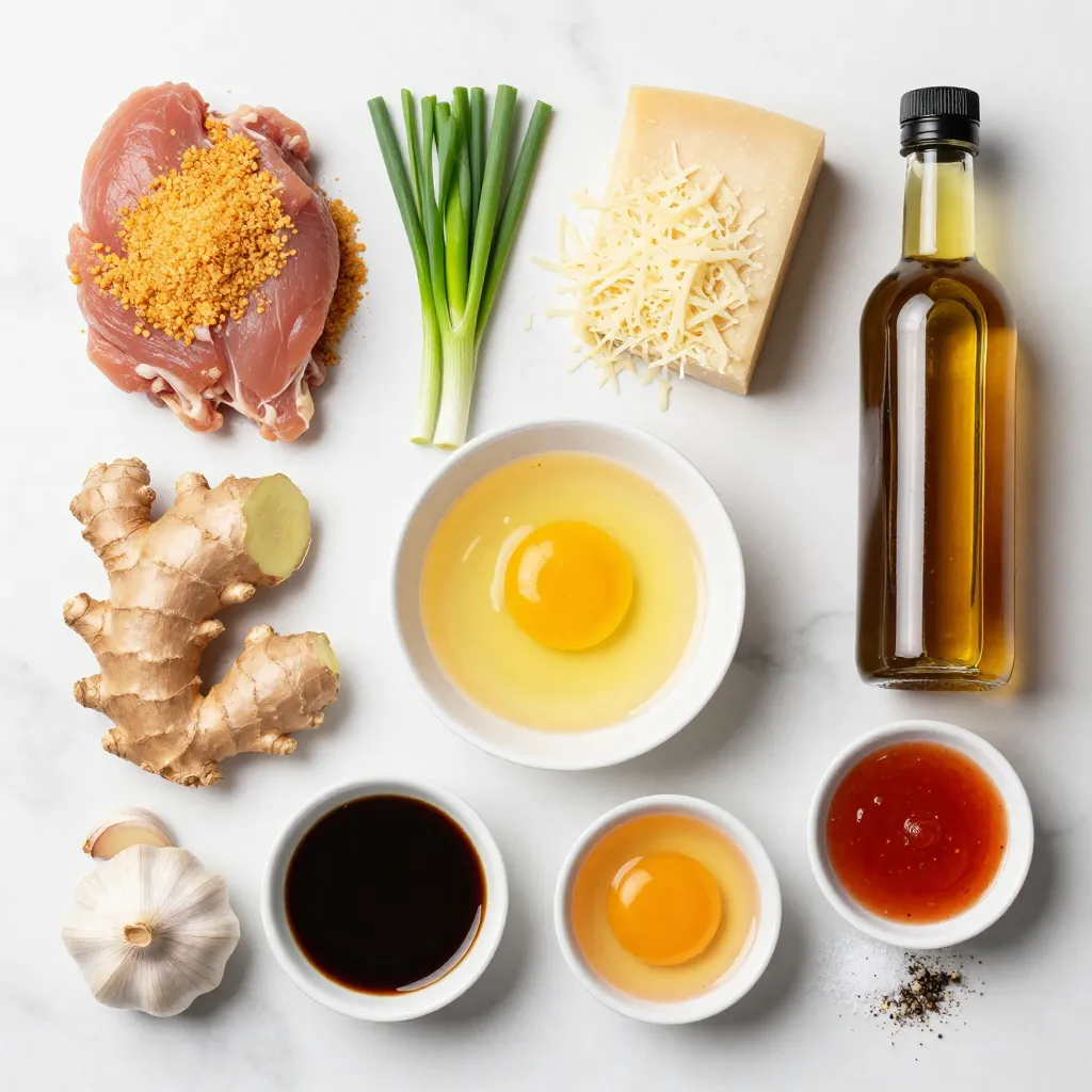 - In a large mixing bowl, combine the ground chicken, breadcrumbs, Parmesan cheese, chopped green onions, beaten egg, minced ginger, minced garlic, soy sauce, and sesame oil.