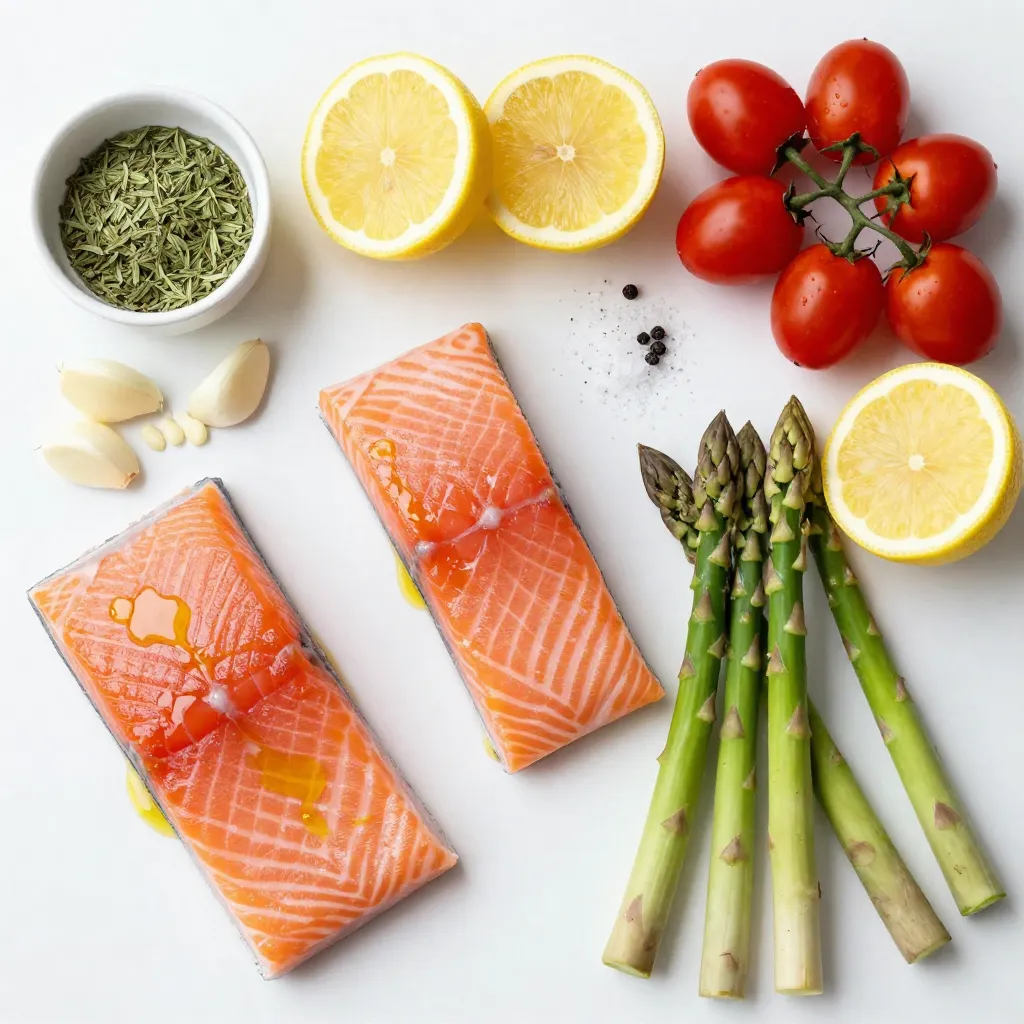 Each ingredient plays a vital role. The salmon provides protein and healthy fats. Garlic adds flavor and health benefits. Lemon offers brightness and tang. The cherry tomatoes and asparagus give color and nutrients.