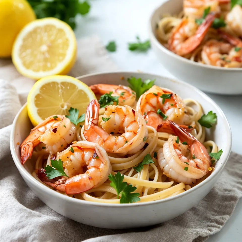 A flavorful shrimp dish with lemon, garlic, and a hint of spice, served over pasta.