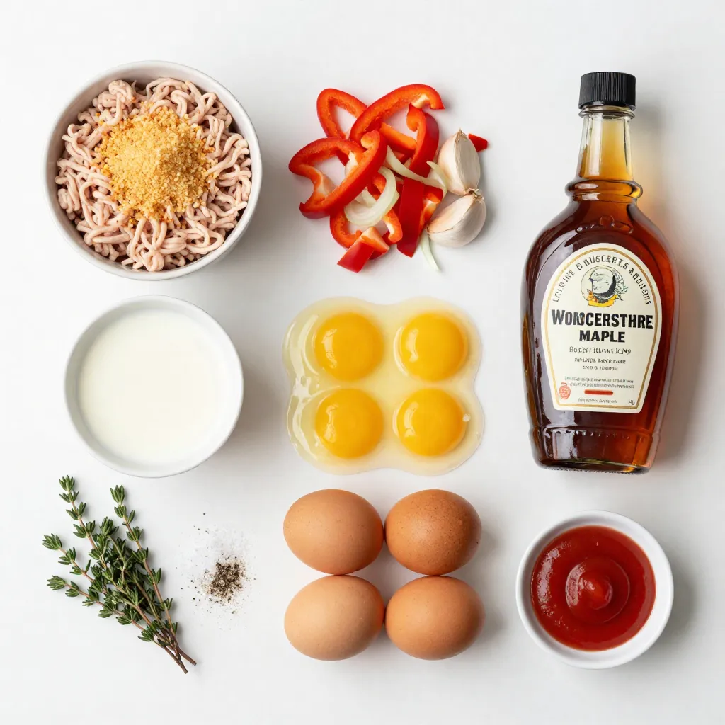 • In a large mixing bowl, combine the ground turkey, breadcrumbs, chopped onion, chopped bell pepper, minced garlic, eggs, milk, ΒΌ cup of maple syrup, Worcestershire sauce, dried thyme, salt, and black pepper.