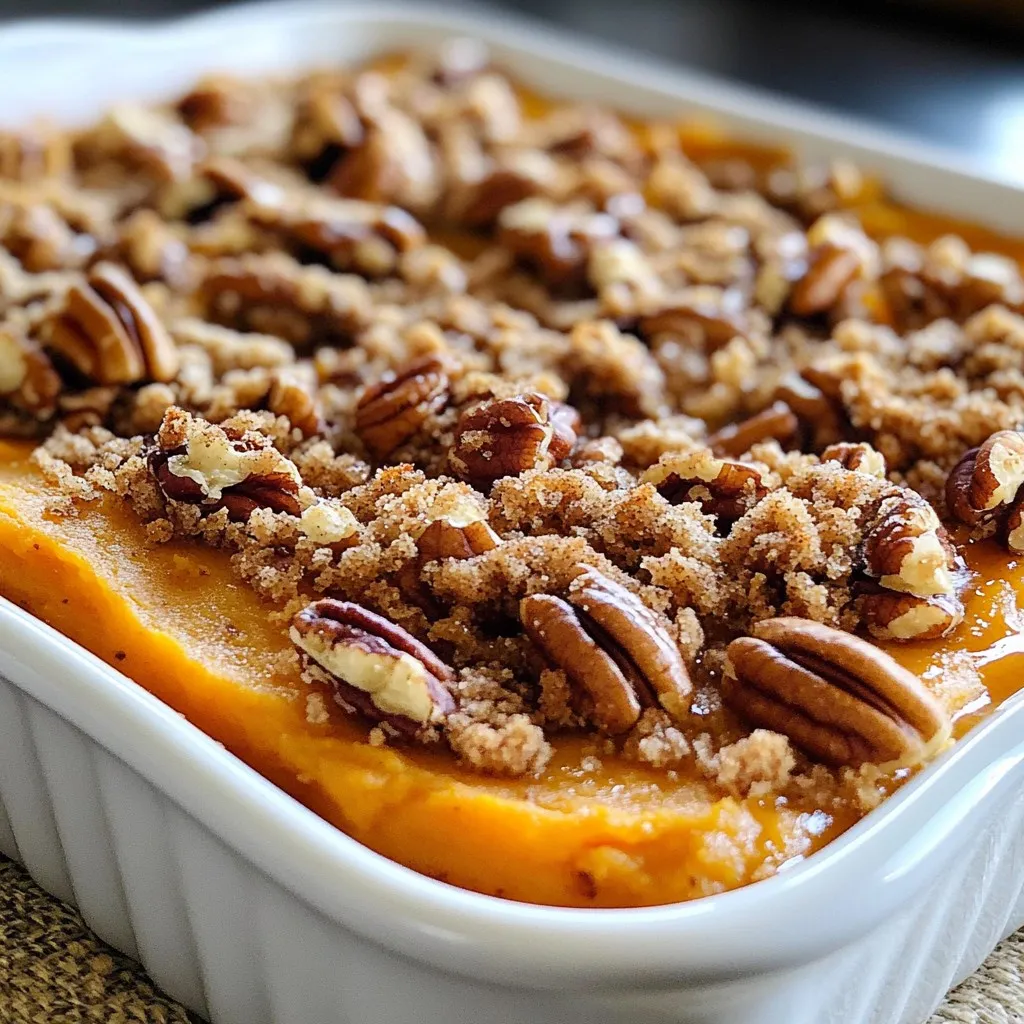 - Sprinkle the pecan topping evenly over the sweet potato mixture.