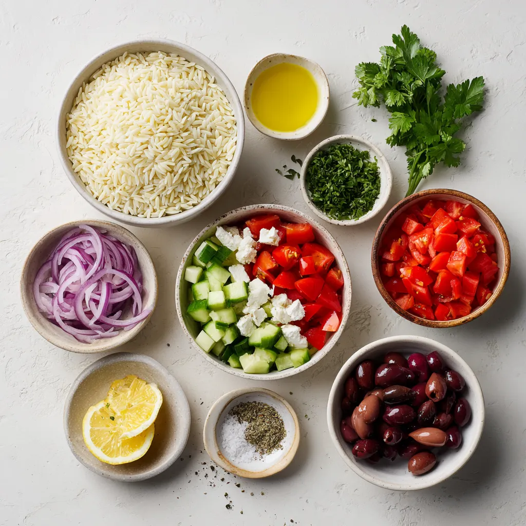 The main ingredients create a colorful and tasty base. The orzo pasta acts as the star. It cooks quickly and absorbs flavors well. Fresh vegetables add crunch and nutrition. Cherry tomatoes give sweetness, while cucumber adds a nice crisp bite. Red bell pepper brings vibrant color. The red onion gives a mild zing. Kalamata olives add a briny touch, and feta cheese gives creaminess. The parsley brings freshness and a pop of green.