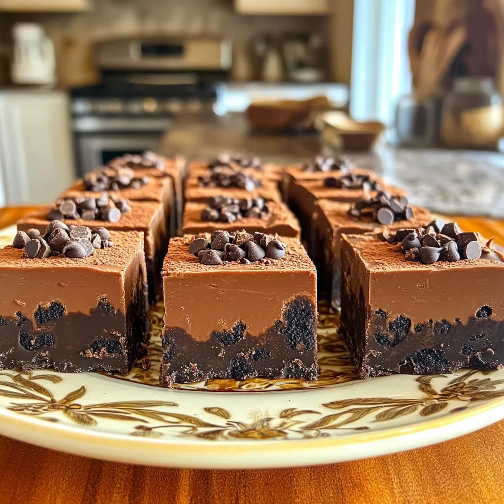 - 24 Oreo cookies, crushed - 1 cup creamy peanut butter - 1/2 cup unsweetened cocoa powder To make these No-Bake Mocha Oreo Fudge Bars, you need a few main ingredients. First, grab 24 Oreo cookies. Crushing them gives the bars their base and flavor. Next, use 1 cup of creamy peanut butter. This creamy texture helps to bind everything together. Finally, include 1/2 cup of unsweetened cocoa powder. This adds a rich chocolate flavor that pairs well with the coffee. - 1/2 cup granulated sugar - 1 teaspoon instant coffee granules - 1/2 cup sweetened condensed milk You also need some additional ingredients. First, add 1/2 cup of granulated sugar for sweetness. This balances the rich flavors. Next, mix in 1 teaspoon of instant coffee granules. It gives a nice mocha kick. Lastly, use 1/2 cup of sweetened condensed milk. This makes the fudge smooth and sweet. - 1/2 teaspoon vanilla extract - 1/4 cup chocolate chips (for topping) You can make your bars even better with optional ingredients. A splash of 1/2 teaspoon of vanilla extract adds depth to the flavor. If you want, sprinkle 1/4 cup of chocolate chips on top. They melt slightly and create a tasty finish. 1. Start by mixing the dry ingredients. In a large mixing bowl, add 24 crushed Oreo cookies and 1/2 cup of unsweetened cocoa powder. Stir until everything is well blended. This will give your fudge a rich, chocolate base. 2. Now, prepare the peanut butter mixture. In a separate bowl, combine 1 cup of creamy peanut butter, 1/2 cup of granulated sugar, 1 teaspoon of instant coffee granules, 1/2 cup of sweetened condensed milk, and 1/2 teaspoon of vanilla extract. Mix these until the mixture is smooth and lump-free. 3. Next, fold the dry mixture into the peanut butter mixture. Gradually add the cookie and cocoa blend to the peanut butter. Stir gently until everything combines well. The mixture should feel thick and fudgy. 4. Prepare your baking dish. Line an 8x8-inch dish with parchment paper. Leave some paper hanging over the sides. This helps with easy removal later. 5. Pour the fudge mixture into the lined dish. Use a spatula to spread it evenly across the dish. Press down firmly to make a compact layer. If you want, sprinkle 1/4 cup of chocolate chips on top. Press them in gently. 6. Cover the dish with plastic wrap and place it in the refrigerator. Let it chill for at least 2 hours. This step helps the fudge set properly. 7. Once the fudge is set, lift it out using the parchment paper. Cut the fudge into bars. Enjoy your delicious No-Bake Mocha Oreo Fudge Bars! To ensure a smooth fudge, mix your peanut butter and sugar well. Stir until no lumps remain. This step is key to a creamy texture. If you see lumps, your fudge will not be as nice. To achieve that thick and fudgy consistency, use the right amounts of each ingredient. The Oreo cookies and cocoa powder add structure. The sweetened condensed milk and peanut butter provide the creaminess. If your mixture seems too loose, add a bit more cocoa powder. For a beautiful presentation, arrange your fudge bars on a nice platter. Dust them lightly with cocoa powder for a touch of flair. You can also drizzle melted chocolate on top for extra appeal. These fudge bars pair perfectly with coffee. Serve them with a small pot of coffee for dipping. You can also enjoy them with milk or a rich hot chocolate. If your fudge is too soft, don’t worry! Simply put it back in the fridge for another hour. This extra chill often helps firm it up. If your peanut butter mixture is grainy, you can fix it. Just warm it gently in the microwave for about 15 seconds. Stir well, and it should smooth out nicely. {{image_2}} You can easily boost the flavor of your No-Bake Mocha Oreo Fudge Bars. Try adding more chocolate to the mix. Using dark chocolate or chocolate syrup can deepen the taste. You might also mix in crushed nuts for a nice crunch. Walnuts or almonds work well in this recipe. For a fun twist, swap Oreo cookies with other cookies, like chocolate chip or peanut butter cookies. If you need gluten-free fudge bars, you can find gluten-free Oreo cookies. Substitute them in the recipe, and you’re all set. For a dairy-free option, use almond or coconut milk instead of sweetened condensed milk. You can also try a nut-based creamy spread in place of peanut butter. These changes allow everyone to enjoy the treat. Layering flavors can create a new experience. Try adding a layer of caramel or nuts between the fudge layers. Seasonal variations can also make a difference. Add pumpkin spice in fall or peppermint in winter for a festive touch. You can even add fruit, like cherries or raspberries, for a fresh burst of flavor. The possibilities are endless! To keep your No-Bake Mocha Oreo Fudge Bars fresh, store them in an airtight container. This helps prevent them from drying out or absorbing other smells in your fridge. I recommend using a glass or plastic container with a tight lid. You can also use parchment paper between layers to avoid sticking. You can freeze these fudge bars for longer storage. First, cut the bars into pieces. Then, wrap each piece in plastic wrap. Place the wrapped bars in a freezer-safe bag or container. They will stay fresh for up to three months. When you want to enjoy them, simply take out the desired amount and let them thaw in the fridge for a few hours or on the counter for about 30 minutes. In the fridge, your fudge bars will last about a week. Always check them for signs of spoilage before eating. If you see any mold or if they smell off, it’s best to toss them. Keeping them in an airtight container will help maintain their flavor and texture. Yes, you can use crunchy peanut butter. It will give the fudge a fun texture. However, it may change how smooth the fudge feels. You may notice little bits of peanut in each bite. If you like that crunch, go for it! You need to refrigerate the fudge for at least 2 hours. This time helps it set properly. If you leave it longer, the fudge will not 