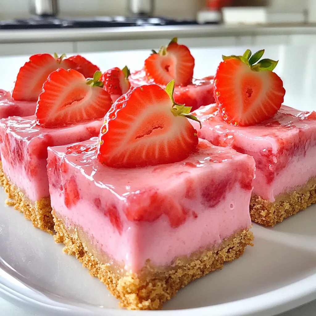 These ingredients create a bright, sweet, and tangy treat. The graham cracker crumbs form a crunchy base. The melted butter helps bind the crumbs together. Granulated sugar sweetens the crust nicely. Fresh strawberries add fruitiness, and lemon juice brings a zesty kick. Sweetened condensed milk gives the filling creaminess. Lemon zest adds extra flavor. Finally, fresh strawberries on top make each bar look great.