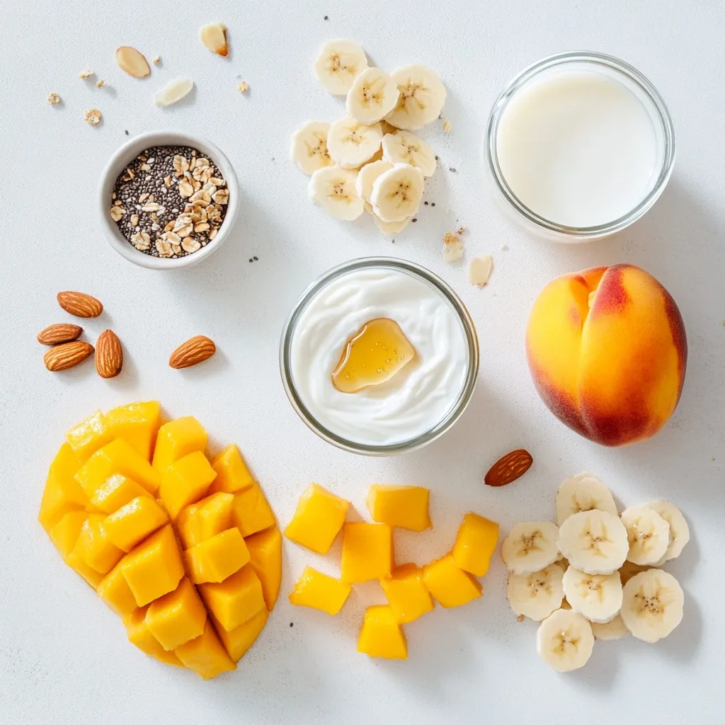 • In a blender, combine the diced peach, mango, banana, Greek yogurt, coconut milk, honey, and vanilla extract.