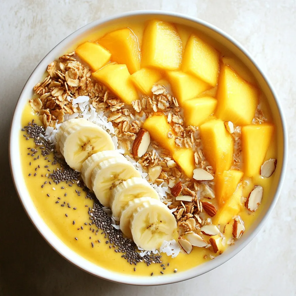 - 1 ripe peach, diced - 1 ripe mango, diced - 1 banana, sliced Fresh fruit makes this bowl bright and tasty. Ripe peaches and mangoes bring sweetness and a smooth texture. Bananas add creaminess and natural sweetness. Use fruit that is soft but not overripe. - 1 cup Greek yogurt - 1/2 cup coconut milk Greek yogurt adds protein and creaminess. It also gives a nice tang. Coconut milk makes the bowl rich and smooth. You can adjust the amount for a thinner mix if needed. - 1 tablespoon honey or maple syrup - 1/2 teaspoon vanilla extract Honey or maple syrup adds more sweetness. You can choose based on your taste. Vanilla extract makes the flavors pop and adds warmth. - Granola - Sliced almonds - Chia seeds - Fresh fruit - Coconut flakes Toppings add crunch and color. Granola gives a nice crunch. Sliced almonds add texture and healthy fats. Chia seeds boost nutrition. Use fresh fruit for extra flavor and coconut flakes for a tropical touch. Mix and match toppings to make it your own! {{ingredient_image_1}} Start by dicing the ripe peach and mango. Use a sharp knife to cut them into small pieces. This makes it easier to blend. Next, slice the banana into thin rounds. Each slice should be about a half-inch thick. Set all the fruit aside. Now, combine all the ingredients in a blender. Add the diced peach, mango, banana, Greek yogurt, and coconut milk. Pour in the honey and vanilla extract too. Blend on high speed until the mixture looks smooth and creamy. If it feels too thick, add a bit more coconut milk. Blend again until you reach the right consistency. Once blended, pour the smoothie mixture into a bowl. Use a spatula to scrape every bit out. Now, it's time to decorate! Add toppings like granola, sliced almonds, chia seeds, and extra fruit. A sprinkle of coconut flakes adds a nice touch. Serve right away with a spoon and enjoy! To get the right thickness, I recommend using coconut milk. Start with half a cup in your mix. If it's too thick, add more coconut milk to smooth it out. Using frozen fruits is another great trick. Frozen peaches or mangoes help keep your smoothie bowl cold and thick. They blend well and add a nice texture. If you're looking for sweet flavor, try alternatives to honey or maple syrup. Agave syrup or date syrup works well. You can also use flavored Greek yogurt to add a twist. Try vanilla or peach-flavored yogurt for extra taste. This small change can make a big difference in your bowl's flavor. Presentation makes your smoothie bowl special. Use creative topping combinations. Picture fresh fruit, crunchy granola, and coconut flakes all together. It's a feast for the eyes! Choose colorful bowls too. A bright bowl makes your dish pop. The more vibrant it looks, the more fun it is to eat. Pro Tips Choose Ripe Fruits: Ensure your peach and mango are perfectly ripe for the sweetest flavor. Look for fruits that yield slightly to pressure and have a fragrant aroma. Adjust Consistency: If your smoothie bowl is too thick, add a splash more coconut milk until you reach your desired creamy consistency. This will make it easier to enjoy with a spoon! Experiment with Toppings: Feel free to mix and match your favorite toppings. Consider adding nuts, seeds, or even a drizzle of nut butter for extra flavor and nutrition. Make It Ahead: Prepare the smoothie mixture the night before and store it in the fridge. In the morning, just add your toppings for a quick and delicious breakfast! {{image_2}} You can mix fruits in your smoothie bowl for fun and flavor. Besides peach and mango, try adding berries, like strawberries or blueberries. Pineapple adds a tropical twist too. Seasonal fruits work great too! In summer, fresh berries shine. In fall, add apples or pears for a cozy taste. If you want a dairy-free option, use almond or soy yogurt instead of Greek yogurt. Coconut yogurt is a great choice too. For vegan eaters, swap honey for maple syrup. This keeps your bowl sweet and plant-based. Boost your smoothie bowl with protein powders or superfoods. Adding a scoop of protein powder helps keep you full. Chia seeds or flaxseeds offer healthy fats and fiber. Nuts like almonds or walnuts add crunch. You can mix and match these add-ins for your perfect bowl! To keep your peach mango smoothie bowl fresh, store it in the fridge. Use an airtight container to prevent spills and keep out air. The smoothie bowl will stay good for about one day. If you want to save it longer, consider freezing it instead. You can freeze smoothie leftovers for later. To do this, pour the smoothie into an ice cube tray or a freezer-safe container. This way, you can use individual portions later on. When you want to eat it, take it out and let it thaw in the fridge overnight. You can also blend it again if you like it smooth. Preparing your smoothie bowl in advance saves time. You can blend the smoothie base and store it in the fridge. Just remember to keep your toppings separate. Adding fresh toppings right before serving keeps them crunchy and tasty. This method makes it easy to enjoy a healthy treat anytime! You can use regular yogurt or a plant-based option. Almond or coconut yogurt works well. These substitutes keep the bowl creamy. Yes, you can make it vegan! Use plant-based yogurt and maple syrup instead of honey. This way, you enjoy the same great taste without animal products. A smoothie bowl lasts about one day in the fridge. It is best to eat it fresh. If you store it, cover it well to keep it from getting brown. Absolutely! Adding protein powder boosts the nutrition. Mix a scoop in with the other ingredients before blending. This makes for a filling meal or snack. A peach mango smoothie bowl is packed with vitamins. Peaches are high in Vitamin C and fiber. Mangos offer Vitamin A and antioxidants. Together, they support your skin and digestion. Greek yogurt adds protein and probiotics, which are good for gut health. This bowl is a tasty way to stay healthy! This blog post guides you through making a tasty peach 