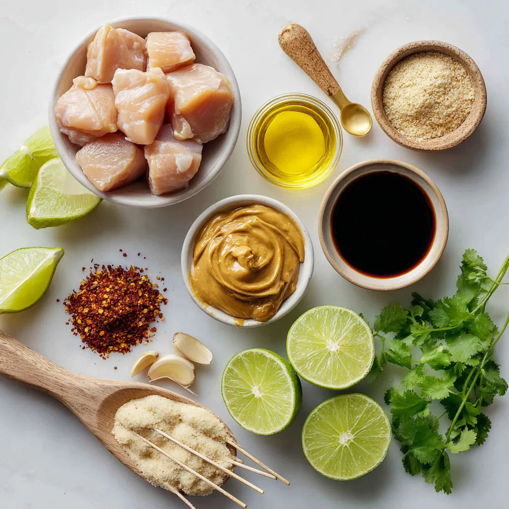 You will need chicken thighs for this recipe. They stay juicy and tender when grilled. The creamy peanut butter gives a rich flavor and smooth texture. Soy sauce adds salt and umami. Honey brings sweetness and balances the flavors. Fresh lime juice adds a bright, zesty touch. Sesame oil gives a nice nutty flavor, while ginger and garlic add depth. If you like some heat, cayenne pepper is your friend. Finally, soak the wooden skewers in water. This prevents them from burning on the grill.