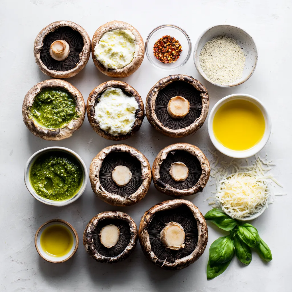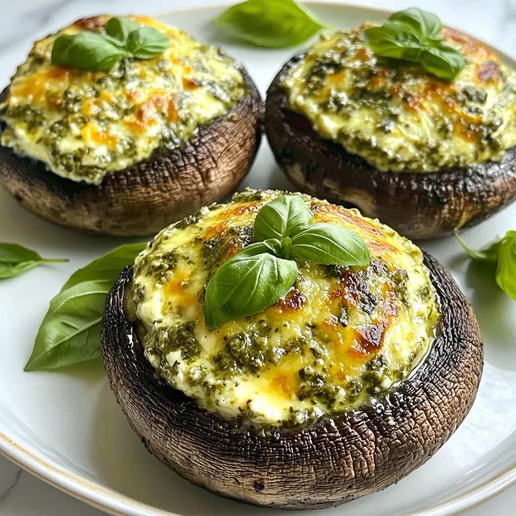 To make pesto ricotta stuffed mushrooms, you will need: - 12 large portobello mushrooms, stems removed - 1 cup ricotta cheese - 1/2 cup basil pesto - 1/4 cup grated Parmesan cheese - 1/4 teaspoon garlic powder - 1/4 teaspoon red pepper flakes (optional for heat) - Salt and pepper to taste - 2 tablespoons olive oil - Fresh basil leaves for garnish Each ingredient plays a key role in the flavor and texture of the dish. - Mushrooms: Choose large portobello mushrooms for a strong base. - Ricotta cheese: This soft cheese adds creaminess. - Basil pesto: Use fresh or jarred pesto for a vibrant taste. - Parmesan cheese: Grated Parmesan adds a savory touch. - Garlic powder: This gives a gentle garlic flavor. - Red pepper flakes: Use these for a spicy kick, if you like. - Salt and pepper: These enhance all flavors. - Olive oil: Brush this on mushrooms for a tasty finish. - Basil leaves: Use fresh basil for a lovely garnish. You can make this dish your own by trying different options. - Cheese: Swap ricotta for goat cheese or cream cheese for a twist. - Veggies: Add spinach or sun-dried tomatoes for extra flavor. - Herbs: Try adding thyme or oregano for more depth. - Nuts: Chopped walnuts or pine nuts can add crunch. - Gluten-free option: Use gluten-free breadcrumbs instead of cheese for a different texture. {{ingredient_image_1}} Start by preheating your oven to 375°F (190°C). This helps cook the mushrooms evenly. Next, get a mixing bowl. In this bowl, combine 1 cup of ricotta cheese, 1/2 cup of basil pesto, and 1/4 cup of grated Parmesan cheese. Add 1/4 teaspoon of garlic powder and 1/4 teaspoon of red pepper flakes if you like heat. Season with salt and pepper to taste. Stir this mix until it's smooth and well-blended. Now, take 12 large portobello mushrooms. Remove the stems gently. Brush them with 2 tablespoons of olive oil. Place the mushrooms cap-side up on a baking sheet. This step keeps the filling in place. Next, fill each mushroom cap with the ricotta-pesto mixture. Make sure to mound it slightly for a generous bite. Once filled, place the baking sheet in your preheated oven. Bake the stuffed mushrooms for 20-25 minutes. You know they’re done when they are tender and the tops look golden and bubbly. After baking, carefully remove the mushrooms from the oven. Let them cool slightly before moving them to a serving plate. This cooling helps avoid burns and allows the flavors to settle. Garnish your stuffed mushrooms with fresh basil leaves for a pop of color. You can serve these mushrooms as a tasty appetizer or a side dish. They pair well with a simple salad or a crusty piece of bread. You can also enjoy them as a light main dish with a side of roasted veggies. Feel free to get creative with your serving ideas! To make your Pesto Ricotta Stuffed Mushrooms shine, focus on quality. Use fresh basil pesto; it adds a vibrant taste. Choose a creamy ricotta cheese for a rich texture. For a little kick, add red pepper flakes. Adjust salt and pepper to suit your taste. Mixing these ingredients well ensures every bite bursts with flavor. Start by choosing large portobello mushrooms. They hold the filling well and have great flavor. Remove the stems gently to avoid breaking the caps. Brush each mushroom with olive oil. This helps them brown nicely in the oven. Bake until tender, about 20-25 minutes. Keep an eye on them to get that golden top. If you have leftovers, store them in an airtight container. Place them in the fridge. They stay fresh for up to three days. Reheat in the oven for the best results. This keeps the mushrooms tender and the filling creamy. You can also enjoy them cold as a tasty snack! Pro Tips Choose the Right Mushrooms: Opt for large, firm portobello mushrooms for the best results. They provide a sturdy base for the filling and offer a rich flavor. Customize Your Filling: Feel free to add other ingredients to the ricotta mixture, such as chopped sun-dried tomatoes or spinach, for extra flavor and nutrition. Perfect Baking Technique: To ensure even cooking, place the mushrooms cap-side up and avoid overcrowding the baking sheet. This allows for better heat circulation. Serve Fresh: For the best taste and texture, serve the stuffed mushrooms immediately after baking. They can lose their appeal if left to sit too long. {{image_2}} You can use different cheeses to change the flavor. Try cream cheese for a richer taste. Goat cheese adds a tangy kick. If you like a stronger taste, use feta cheese. Blend any cheese with ricotta for a creamy texture. You can boost nutrition by adding veggies to your filling. Spinach works great and adds color. Chopped sun-dried tomatoes give a sweet, rich flavor. You can also mix in finely diced bell peppers. Just sauté them briefly before adding to your cheese mix. To make this dish gluten-free, use gluten-free breadcrumbs. You can also skip breadcrumbs entirely for a low-carb option. Check your pesto for gluten, as some brands may add it. Enjoy these mushrooms as a tasty, safe treat for everyone. A serving of pesto ricotta stuffed mushrooms has about 250 calories. Each mushroom is rich in flavor and low in calories. The dish serves four, so you can enjoy a tasty meal without guilt. These stuffed mushrooms pack a punch of key nutrients: - Protein: Ricotta cheese adds protein for muscle health. - Calcium: Parmesan cheese offers calcium for strong bones. - Vitamins: Fresh basil provides vitamins A and K. - Fiber: Portobello mushrooms add fiber to aid digestion. The ingredients in this dish each bring health benefits: - Ricotta cheese: Low in fat, it supports weight management. - Basil pesto: Rich in antioxidants, it fights inflammation. - Mushrooms: They are low in calories and high in nutrients. - Olive oil: This healthy fat is good for heart health. Choosing these ingredients makes your meal both tasty and nutritious. Yes, you can use different mushrooms. Button mushrooms work well for bite-sized treats. Shiitake mushrooms add a rich flavor. Just 