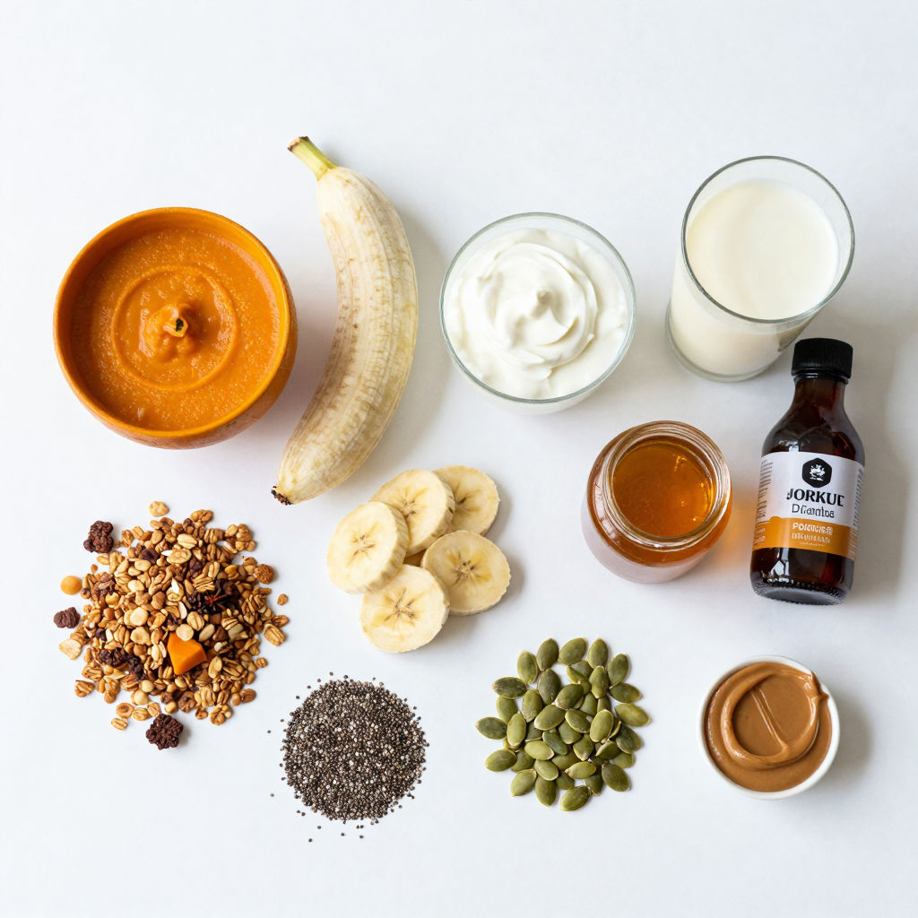 In a blender, combine the pumpkin puree, frozen banana, Greek yogurt, almond milk, maple syrup, vanilla extract, and pumpkin pie spice.
