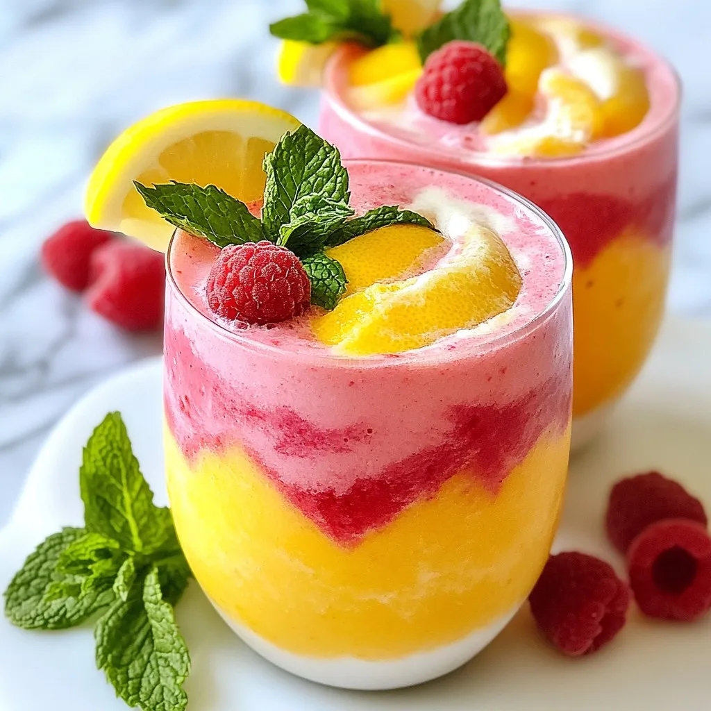 - 1 cup fresh or frozen raspberries - 1 medium banana, peeled and sliced - 1 cup fresh lemonade (homemade or store-bought) - 1/2 cup Greek yogurt - 1 tablespoon honey or maple syrup - 1/2 cup ice cubes (optional) - Fresh mint leaves for garnish The main ingredients for the Raspberry Lemonade Smoothie create a refreshing blend. Raspberries offer a bright, tangy flavor. You can use fresh or frozen ones, depending on what you have. Bananas add natural sweetness and make the smoothie creamy. Fresh lemonade gives it a zesty kick. You can make your own or use store-bought. Greek yogurt is key for a rich and smooth texture. It also packs protein, making your drink more filling. Sweeten it with honey or maple syrup to match your taste. Ice cubes can help thicken the smoothie if you want a colder treat. Finally, don’t forget fresh mint leaves. They add a lovely touch and a pop of color. Each ingredient plays a role in making this smoothie taste great. The balance of sweet and tart is just perfect. Enjoy picking your ingredients! {{ingredient_image_1}} - Start by washing 1 cup of fresh raspberries. If you use frozen raspberries, no need to thaw them. - Next, take a medium banana, peel it, and slice it into rounds. - Choose your lemonade. Fresh homemade lemonade tastes best, but store-bought works well too. - Add the raspberries to your blender first. Then, add the sliced banana. - Pour in 1 cup of fresh lemonade. This gives your smoothie a bright flavor. - Next, add 1/2 cup of Greek yogurt. It makes the smoothie creamy and thick. - If you want it sweeter, add 1 tablespoon of honey or maple syrup. - For a thicker texture, include 1/2 cup of ice cubes. - Blend all the ingredients on high speed until you get a smooth and creamy mix. - After blending, taste your smoothie. If it needs more sweetness, add a bit more honey or syrup. - Pour the smoothie into chilled glasses. - Garnish each glass with fresh mint leaves. This adds color and a fresh smell. To get a smooth and creamy raspberry lemonade smoothie, ice cubes play a big role. They help thicken the drink and make it icy cold. If you want it less thick, skip the ice cubes. You can also adjust the Greek yogurt amount. More yogurt gives a richer texture, while less keeps it lighter. For a beautiful presentation, serve the smoothie in chilled glasses. You can add a slice of lemon on the rim for an extra touch. Fresh mint leaves on top add color and a nice aroma. This smoothie pairs well with light snacks, like whole-grain crackers or a fruit salad. If you have leftovers, store them in a sealed container in the fridge. It tastes best within a day. For longer storage, you can freeze your smoothie in ice cube trays. Just blend the cubes later for a quick treat! Pro Tips Use Frozen Raspberries: If fresh raspberries are not available, frozen raspberries work great and can make your smoothie even colder and thicker. Sweetness Adjustment: Always start with less honey or maple syrup and add more as needed. This ensures you can control the sweetness to your preference. Experiment with Yogurt: For a dairy-free option, try using coconut yogurt or almond yogurt to keep the smoothie creamy while catering to dietary restrictions. Chill Your Glasses: Chilling your glasses in the freezer for a few minutes before serving can enhance the experience by keeping your smoothie colder for longer. {{image_2}} You can make your raspberry lemonade smoothie even better by adding more fruits. Strawberries or blueberries give a sweet taste. They blend well with the tartness of raspberries. Peaches or mangoes add a tropical twist. Their juicy flavors enhance the smoothie’s freshness. You can mix and match to find your perfect blend. If you want a dairy-free smoothie, there are great options. You can use almond or coconut yogurt instead of Greek yogurt. These substitutes keep the smoothie creamy and delicious. For milk, try oat or almond milk. They add a nice flavor while keeping it light and refreshing. Want to take your smoothie up a notch? Try adding some citrus zest. A bit of lemon or lime zest brightens the drink. It adds a zing that pairs well with the raspberry flavor. You can also infuse herbal flavors. Mint or basil adds a unique twist. Their fresh notes make the smoothie feel special and refreshing. One serving of the Raspberry Lemonade Smoothie has about 200 calories. This number may vary based on your ingredients, especially if you adjust the honey or yogurt. Nutritional value of raspberries: Raspberries are low in calories and high in fiber. They have vitamins C and K, which support your immune system. One cup offers about 65 calories and 8 grams of fiber. This makes them a great choice for a healthy treat. Health benefits of Greek yogurt: Greek yogurt is creamy and packed with protein. It has probiotics, which help your gut. One half-cup serving has about 10 grams of protein and only 100 calories. This boosts your smoothie and keeps you full longer. Gluten-free options: All the ingredients in this smoothie are naturally gluten-free. You can enjoy it without worry if you need to avoid gluten. Vegan modifications: To make this smoothie vegan, swap Greek yogurt for a plant-based yogurt. You can also use agave nectar instead of honey. This way, you still get a tasty treat without animal products. Yes, you can use frozen raspberries. They still taste great! They also make your smoothie cold and thick. Just toss them in the blender like fresh ones. You can store the smoothie in the fridge for one day. It tastes best fresh, but you can keep it sealed in a jar. Stir it well before drinking. Yes, you can skip the yogurt. If you want creaminess, use a banana or some avocado. This gives a nice texture without yogurt. You can use maple syrup or agave syrup. You can also use stevia or a sugar substitute. Just add it to taste as some options are sweeter than others. To make homemade lemonade, mix 1 cup of fresh lemon juice with 1 cup of water. Add 1 cup of sugar and stir until 