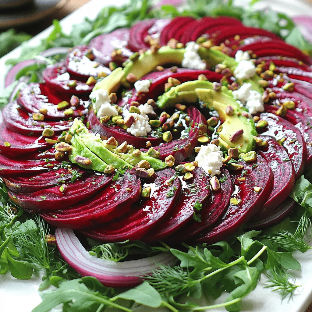 Serve your salad on a large white platter. This helps the colors pop. Arrange the beets in a spiral or fan shape. Layer the greens and avocado nicely. Sprinkle the goat cheese and pistachios on top. Finish with fresh herbs for a burst of color and flavor. This makes the salad look inviting and delicious!