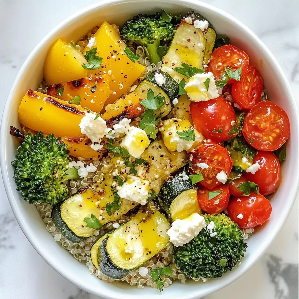 - To assemble the bowls, place a serving of quinoa in each bowl, topped with the roasted vegetables. If desired, sprinkle crumbled feta cheese on top and garnish with fresh parsley.