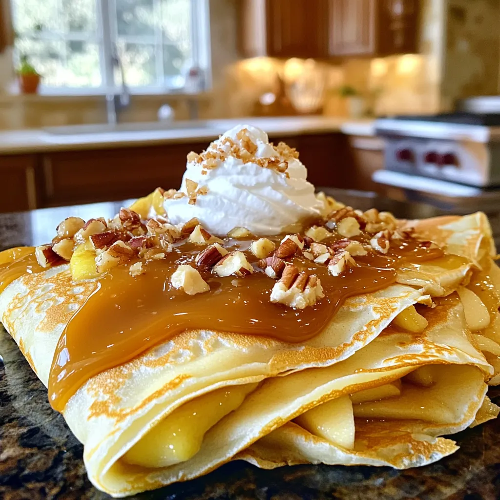 Assembling crêpes is easy and fun. Take a warm crêpe and place it flat on a plate. Spoon a generous amount of the caramelized apple mixture into the center. Fold the crêpe in half, covering the apples. Then, fold it again to make a triangle. This shape holds the filling well. Drizzle extra salted caramel sauce on top for added flavor. Finish with a dollop of whipped cream for creaminess. If you like, add chopped nuts for a nice crunch. Enjoy your delicious creation!
