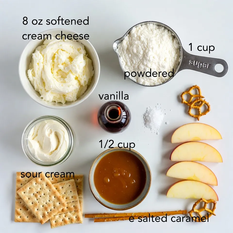 To make this salted caramel cheesecake dip, you need simple ingredients. First, you start with cream cheese. Make sure it is softened. This helps it mix well. Next, you will use powdered sugar. This adds sweetness and helps with texture. Sour cream adds creaminess and a slight tang.