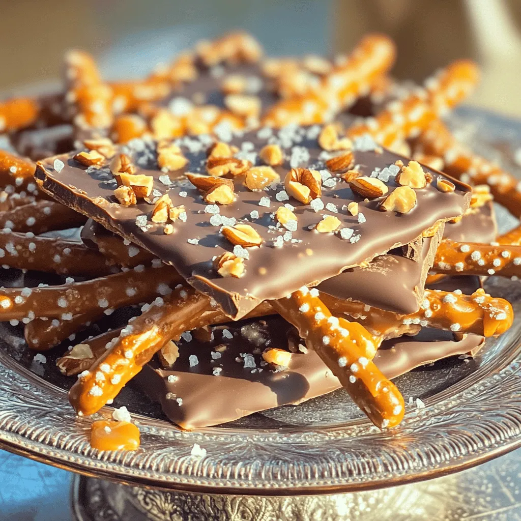 To make this tasty salted caramel pretzel bark, gather these items: - 2 cups pretzel sticks - 1 cup semi-sweet chocolate chips - 1 cup caramel sauce - 1 teaspoon sea salt - 1/2 cup chopped nuts (like pecans or almonds) - Optional: 1/4 cup flaked sea salt for garnish When choosing pretzel sticks, look for thicker ones. They hold up better and add crunch. For the chocolate, semi-sweet chocolate chips work best for a nice balance of sweet and salty. Always pick a high-quality caramel sauce. This helps in achieving a smooth texture and rich taste. For the nuts, select your favorites. Pecans give a nice earthy flavor, while almonds add a subtle crunch. If you want extra saltiness, grab some flaked sea salt for that perfect finish. If you need a gluten-free option, use gluten-free pretzels. For a nut-free bark, skip the nuts or replace them with seeds. You can use dairy-free chocolate chips if you prefer a vegan treat. The caramel sauce can also be made from coconut milk for a unique twist. This way, everyone can enjoy this delightful snack! Gather all your ingredients first. You will need: - 2 cups pretzel sticks - 1 cup semi-sweet chocolate chips - 1 cup caramel sauce - 1 teaspoon sea salt - 1/2 cup chopped nuts (like pecans or almonds) - Optional: 1/4 cup flaked sea salt for garnish Start by preheating your oven to 350°F (175°C). Line a baking sheet with parchment paper. This helps with easy cleanup later. Spread the pretzel sticks in a single layer on the sheet. Make sure they form a nice rectangle or square. Next, bake the pretzels for about 5 minutes. This makes them a bit crisp and easy to coat. While they bake, prepare your chocolate. In a microwave-safe bowl, add the semi-sweet chocolate chips. Melt them in 30-second bursts. Stir after each burst until you have a smooth mix. Once the pretzels are done, take them out of the oven. Drizzle the melted chocolate evenly over the pretzels. Ensure all the pretzels get a good coat. Now, heat the caramel sauce in another microwave-safe bowl. It should warm up in about 20-30 seconds. When it's warm and pourable, drizzle it over the chocolate-covered pretzels. This creates a lovely marbled look. Now it’s time to add some crunch. Sprinkle the chopped nuts evenly on top of the caramel. This adds great texture and flavor. Finally, sprinkle the sea salt over everything. This gives you that perfect sweet and salty mix. Place the baking sheet in the fridge for about 1 hour. This lets everything set well. Once it’s firm, you can break the bark into pieces. Serve them up or store in an airtight container. Enjoy your tasty treat! To get smooth chocolate, use semi-sweet chocolate chips. Place them in a microwave-safe bowl. Heat the chocolate in 30-second bursts. Stir well after each heating. This method helps prevent burning. If the chocolate is thick, add a teaspoon of oil. This makes it smoother. You want it to pour easily over the pretzels. Warm your caramel sauce before using. Heat it in the microwave for 20-30 seconds. This makes it easy to drizzle. Pour the warm caramel slowly over the chocolate. Use a spatula to spread it evenly. This ensures every bite has that sweet flavor. If you want a fun pattern, drizzle in a back-and-forth motion. Use sea salt for the best flavor. Sprinkle it lightly over the caramel layer. Start with a small pinch and taste. You can always add more salt later. Too much salt can overpower the sweet taste. If you're unsure, try using flaked sea salt. It gives a nice crunch and a balanced flavor. {{image_2}} You can change the nuts to mix up the taste. Pecans and almonds work great. Walnuts add a nice crunch too. If you want a sweeter bite, try cashews. You can even skip nuts if you prefer plain bark. While semi-sweet chocolate is tasty, dark chocolate brings a rich flavor. White chocolate adds a creaminess that many love. You can even mix different chocolates for a fun look. Just remember, each type will change the bark's taste a bit. Adding flavors can make your bark even better. A splash of vanilla enhances the caramel taste. For a kick, try a bit of espresso powder. It pairs well with chocolate and caramel. You can experiment with spices like cinnamon too. To keep your salted caramel pretzel bark fresh, store it in an airtight container. Make sure the bark is completely cool before you seal it. If you stack pieces, place parchment paper between layers. This avoids sticking and keeps each piece intact. When stored properly, pretzel bark lasts about one week at room temperature. If you want it to last longer, consider refrigeration. The cold helps maintain its crunch and flavor. Always check for any signs of spoilage before eating. If it looks or smells off, it’s best to toss it out. You can freeze pretzel bark for up to three months. Cut it into pieces and wrap each piece in plastic wrap. Then, place the wrapped pieces in a freezer bag. When you're ready to enjoy it, let it thaw at room temperature. Avoid microwaving it, as this can ruin the texture. To make Salted Caramel Pretzel Bark, you need just a few steps. Start by preheating your oven to 350°F (175°C). Line a baking sheet with parchment paper. Spread 2 cups of pretzel sticks on the sheet in a single layer. Bake them for about 5 minutes. This step makes them crisp. Next, melt 1 cup of semi-sweet chocolate chips in a microwave-safe bowl. Do this in 30-second bursts, stirring in between. Once smooth, drizzle the chocolate over the pretzels. Then, heat 1 cup of caramel sauce in another bowl for about 20-30 seconds. Drizzle this over the chocolate. Sprinkle chopped nuts and sea salt on top. Finally, refrigerate for one hour to set. Break into pieces and enjoy! Yes, you can use store-bought caramel sauce. It saves time and effort. Just make sure it is pourable. You can heat it slightly in the microwave if needed. This will help it drizzle better over the pretzels. Store-bought options work great if you want a quick treat. If your chocolate isn't melting well, the